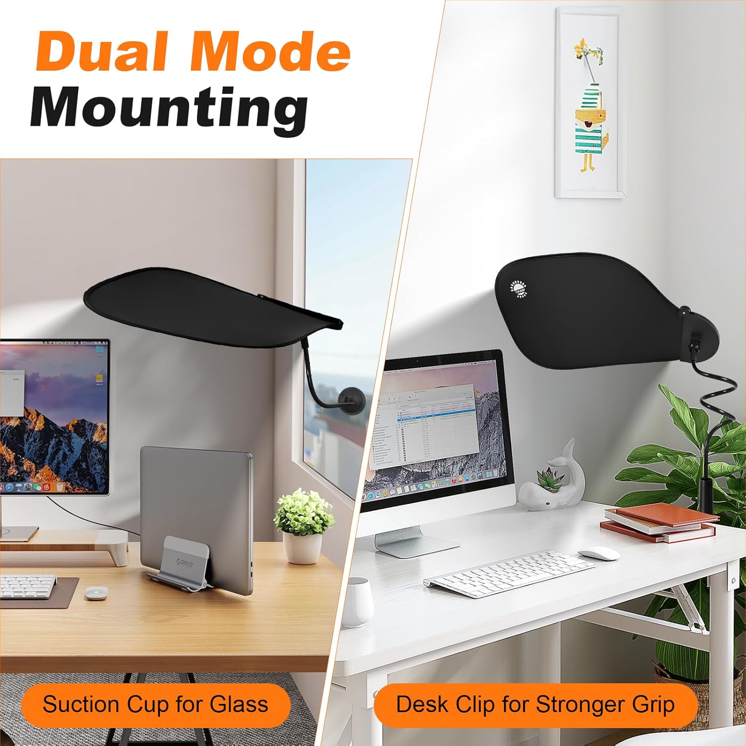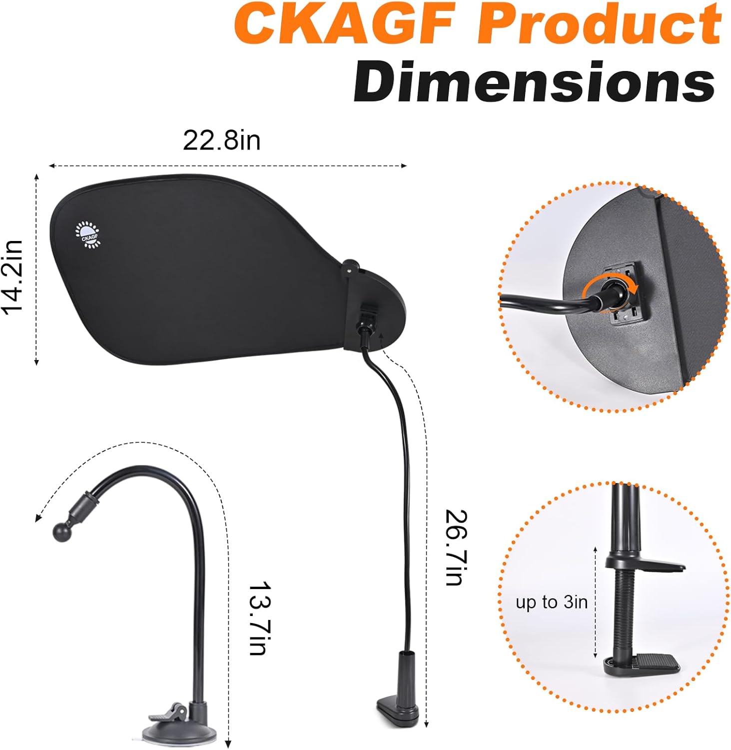 The Adjustable Office Cubicle and Desk Shade is designed to enhance your workspace by blocking unwanted side light. Measuring 22.8" L × 14.2" W, it fits various desk setups. The shade features a 360° adjustable support arm, allowing you to customize the angle for optimal light control. Installation is straightforward and requires no tools, making it easy to set up on flat or rounded surfaces like cubicle walls or shelves.