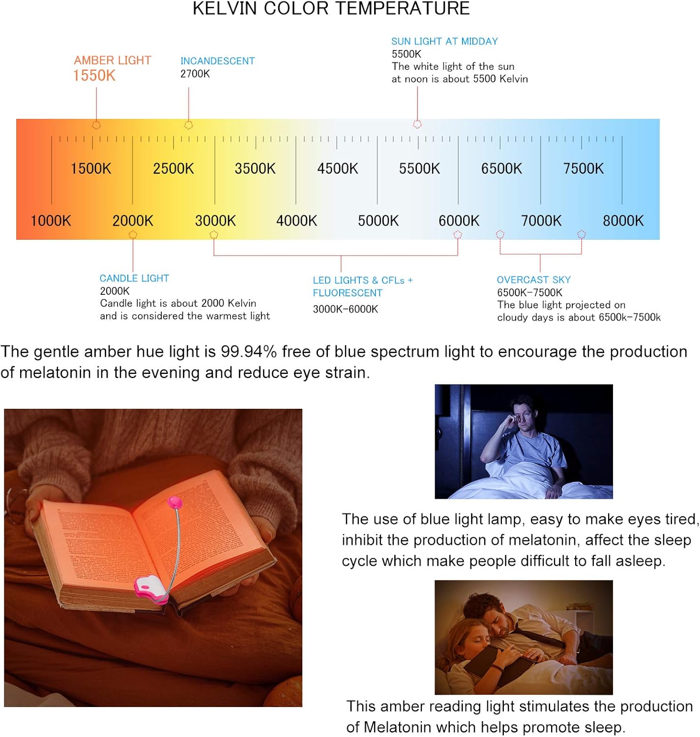 The Amber Reading Light is designed for comfortable reading, especially in bed. It features an ON/OFF switch with a dimmer that allows you to toggle between two lighting modes: a warm white light at 4000K and an amber light at 1550K. This book light effectively blocks 99.94% of blue light, reducing eye strain during late-night reading sessions. With a lifespan of 30,000 hours and a brightness of 25 lumens from two super bright LEDs, it provides ample illumination without harsh glare. The light is rechargeable, taking 2-3 hours to fully charge and offering up to 7 hours of use. Its compact design makes it easy to clip onto books, ensuring you can read comfortably without disturbing others.