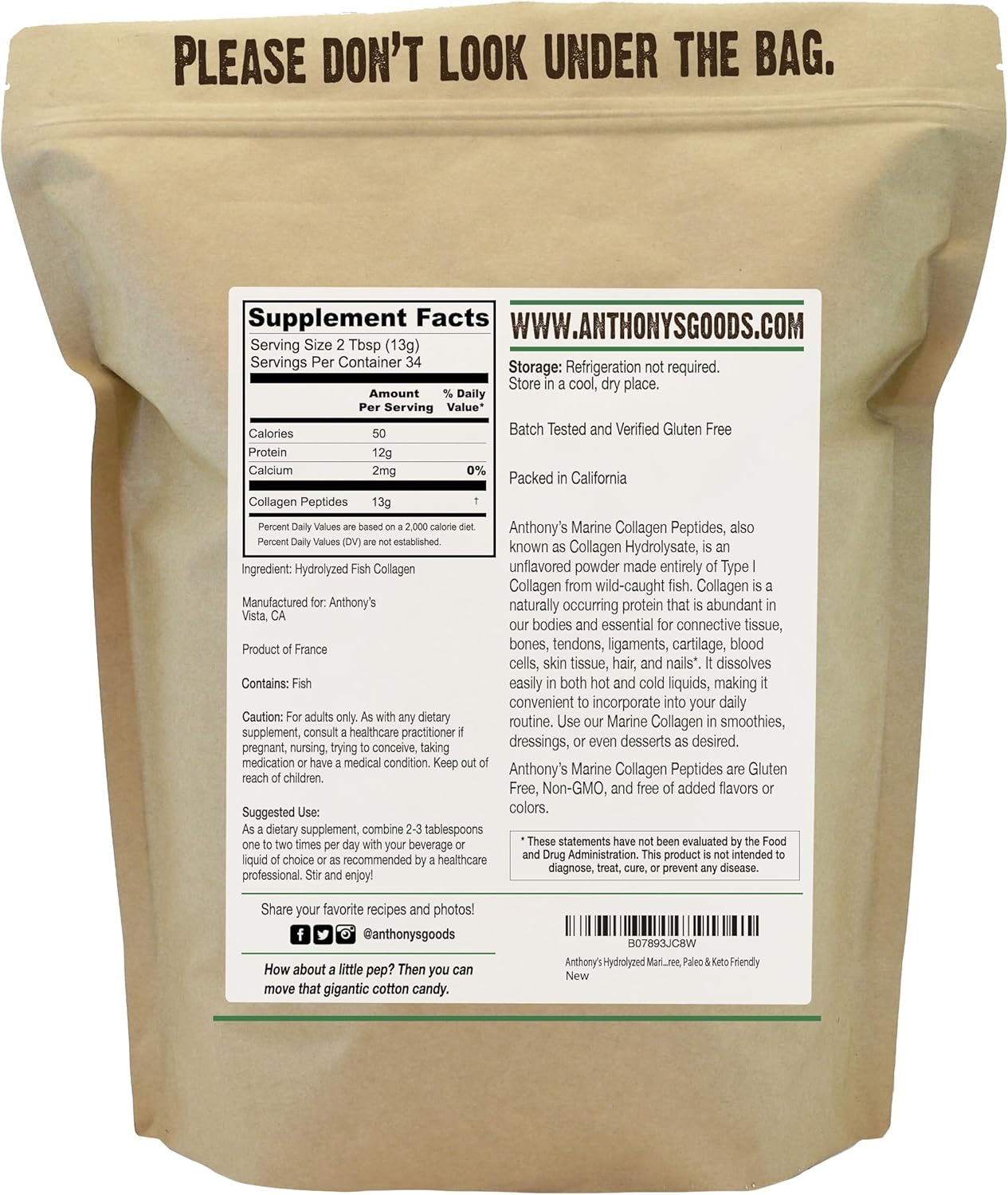 Anthony’s Hydrolyzed Marine Collagen Peptides, Gluten-Free, Paleo and Keto Friendly, Unflavored, 1-Pound