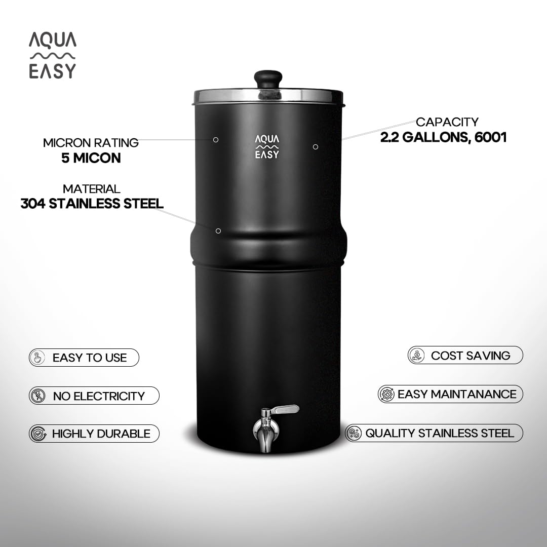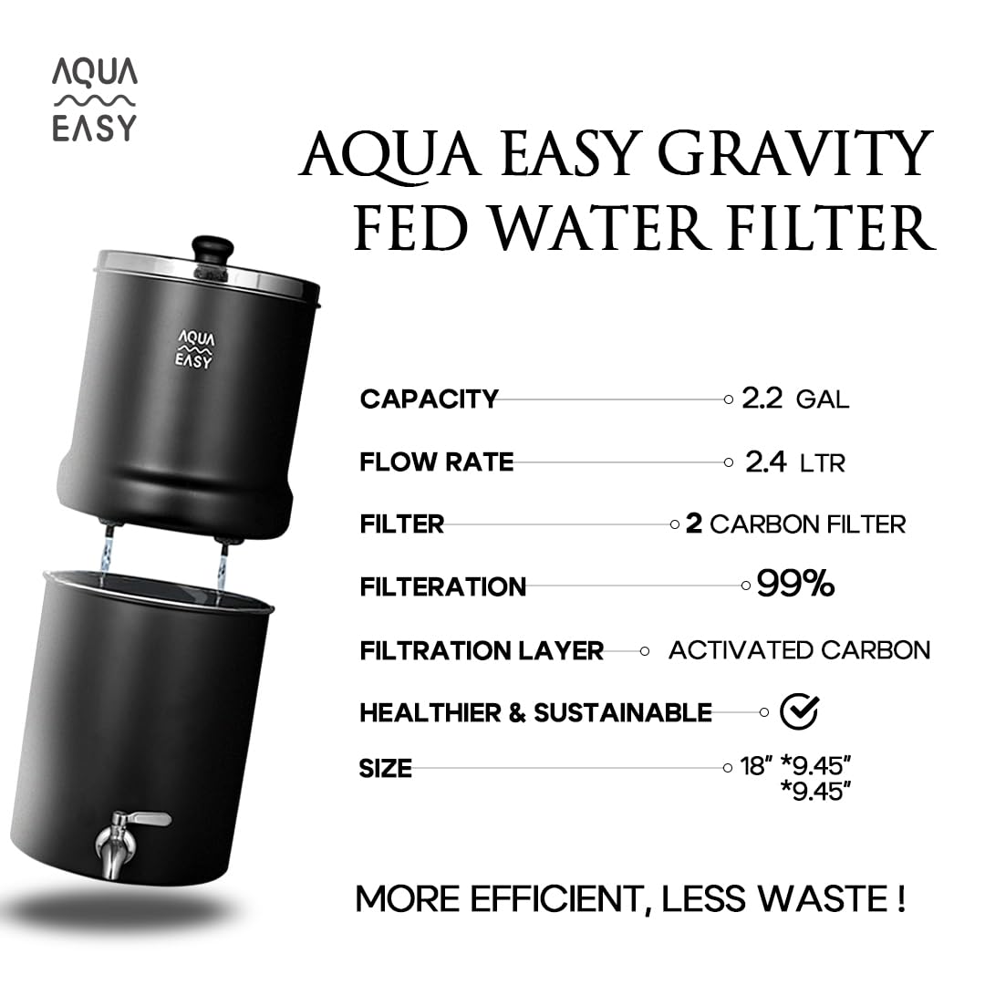 The AquaEasy Stainless Steel Gravity Water Filter System is designed for efficient water filtration using a specialized activated carbon process. It features a 0.01μm hollow filter block that effectively removes chlorine and small particles, ensuring cleaner water. The system's large capacity of 2.25 gallons makes it suitable for families and various settings, from kitchens to camping. Maintenance is straightforward; filters can be cleaned easily under running water, and replacements are quick to install.