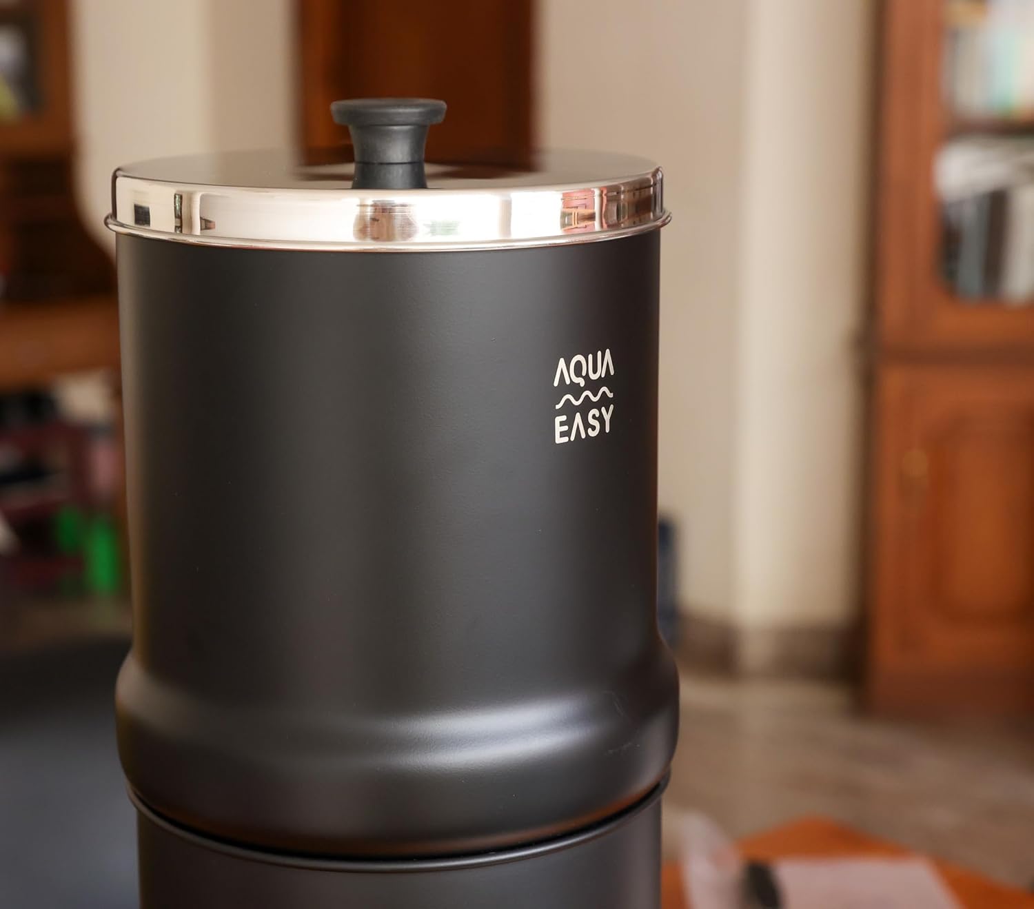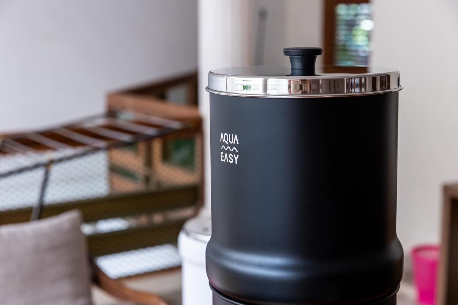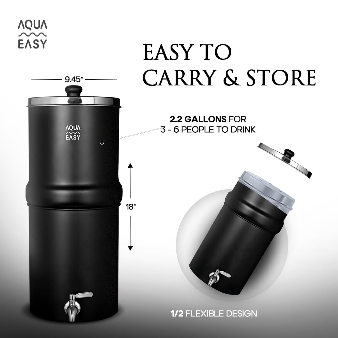 AquaEasy Stainless Steel Gravity Water Filter System (2.25 Gallon) with 2X Activated Carbon Filter, Stainless Steel Tap and Wooden Stand (Black) Countertop Water Filtration System
