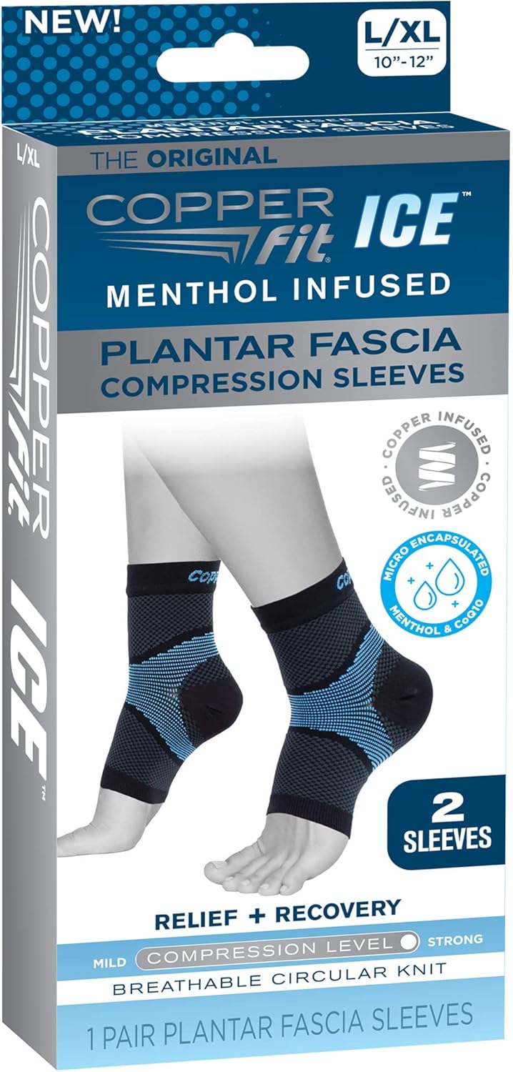 The Copper Fit Standard Ice Plantar Fasciitis Compression Sleeve is designed to provide cold therapy relief for foot discomfort. It is infused with menthol to enhance the cooling effect, making it suitable for use on recently injured or inflamed areas. The sleeve is recommended for 20-minute intervals to effectively numb pain and reduce inflammation. Its compact size makes it easy to wear throughout the day.