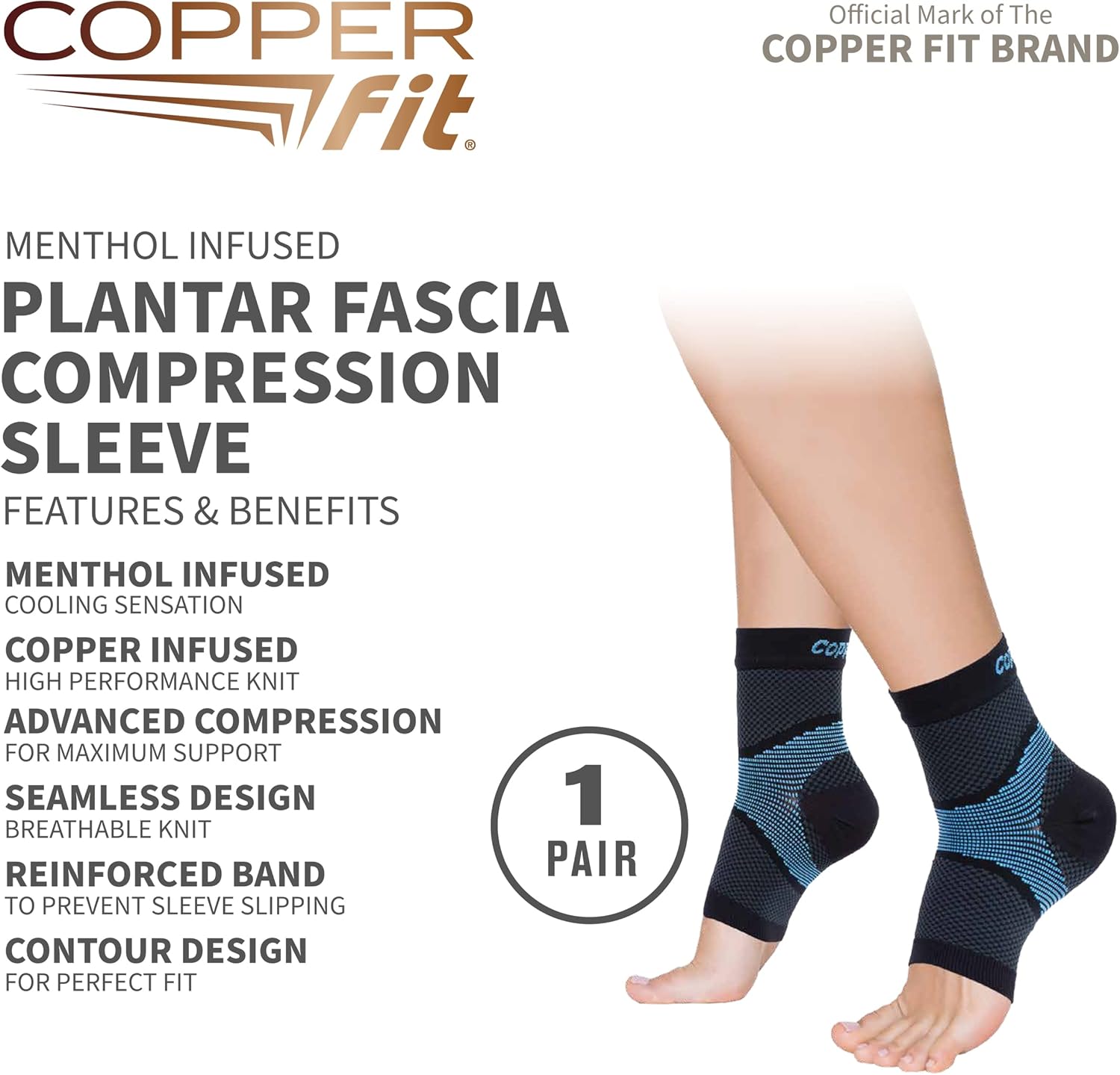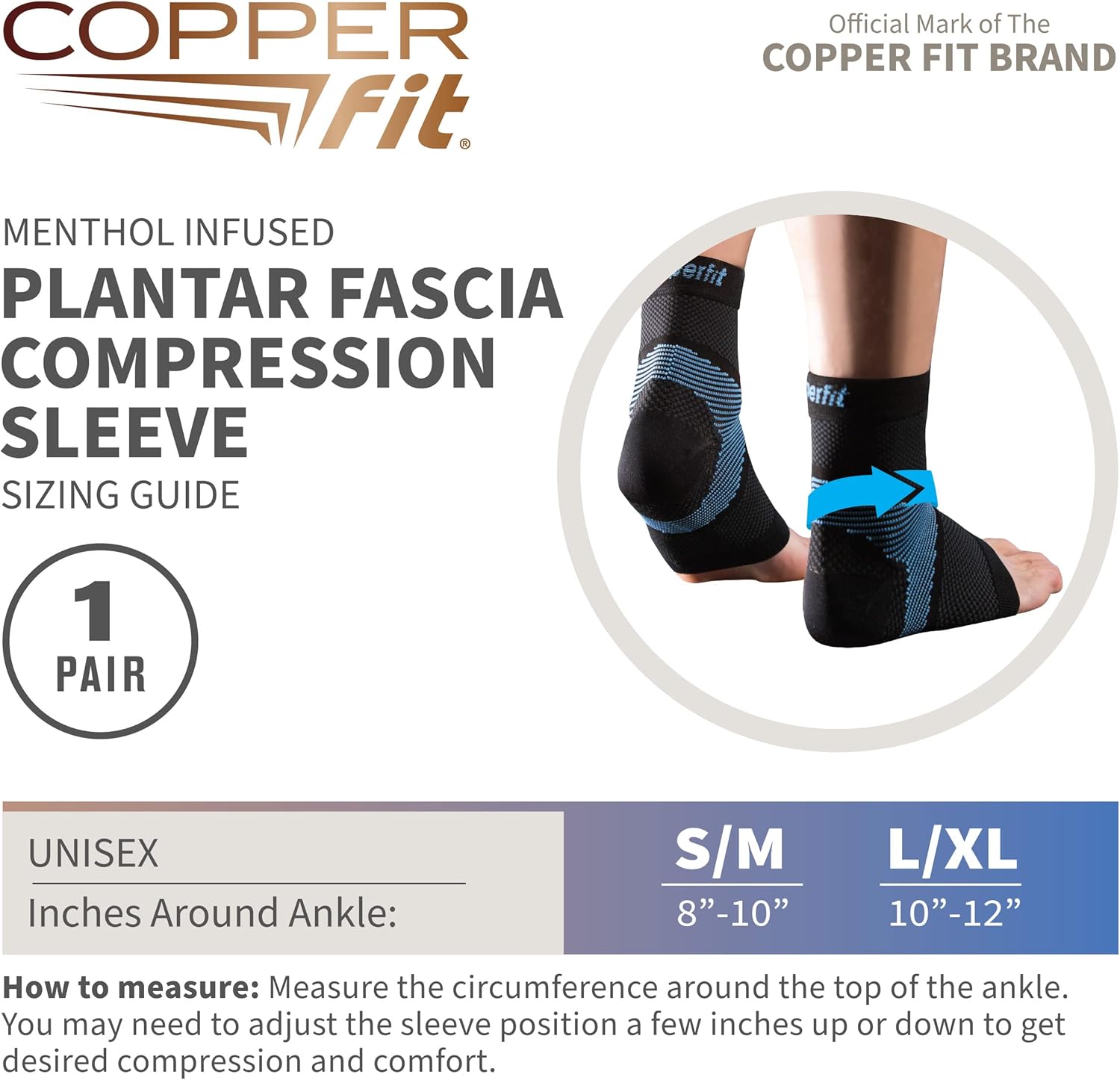 Copper Fit Standard Ice Plantar Fasciitis Compression Sleeve Infused with Menthol, Black, S-M