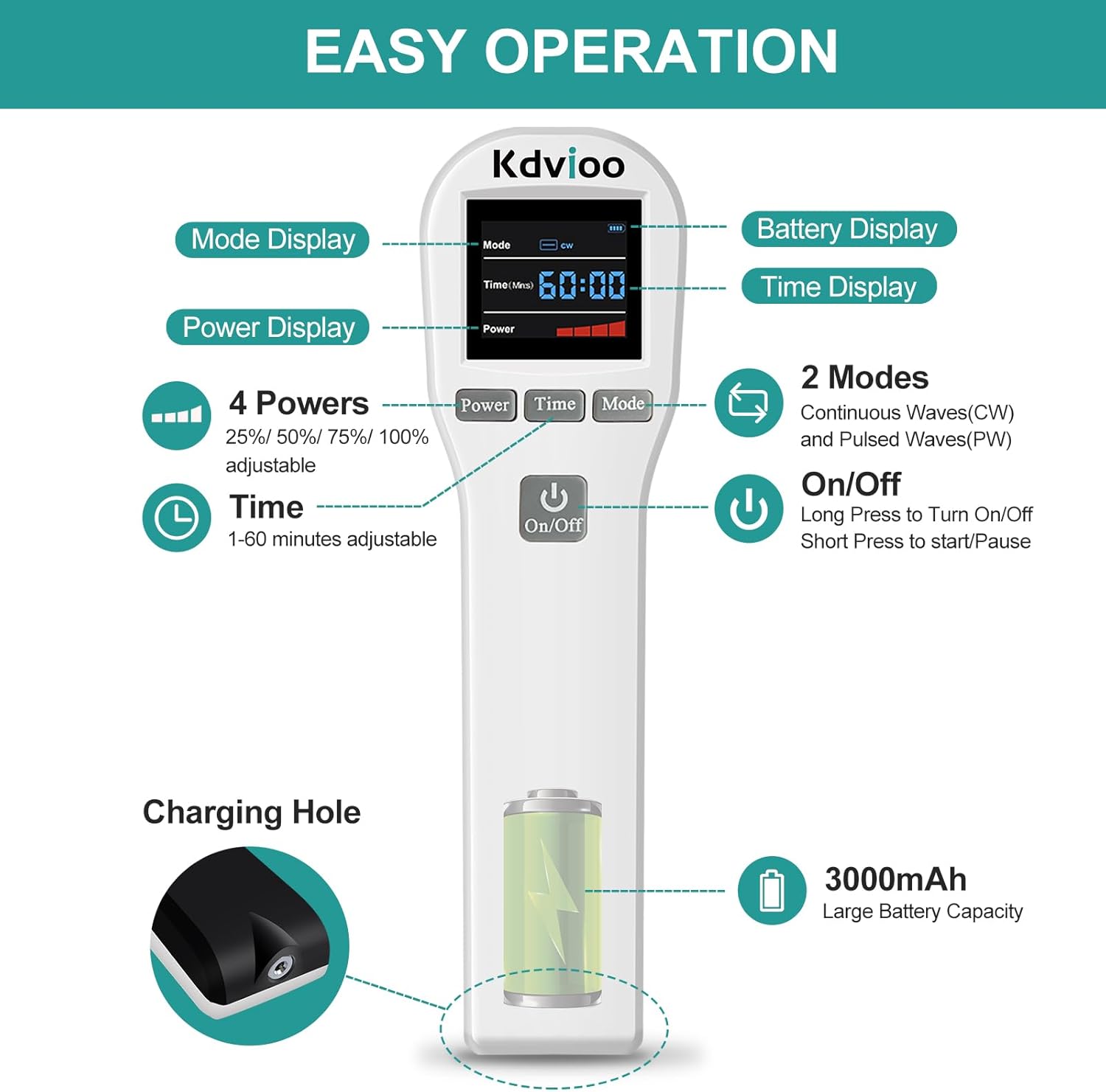 With an LED display for easy operation, it features a timer function and adjustable power levels (25%, 50%, 75%, 100%). Users can set treatment durations from 1 to 60 minutes and choose between continuous and pulsed wave modes. The device is designed for convenience, lasting 5-7 days on a full charge and can be used while charging.