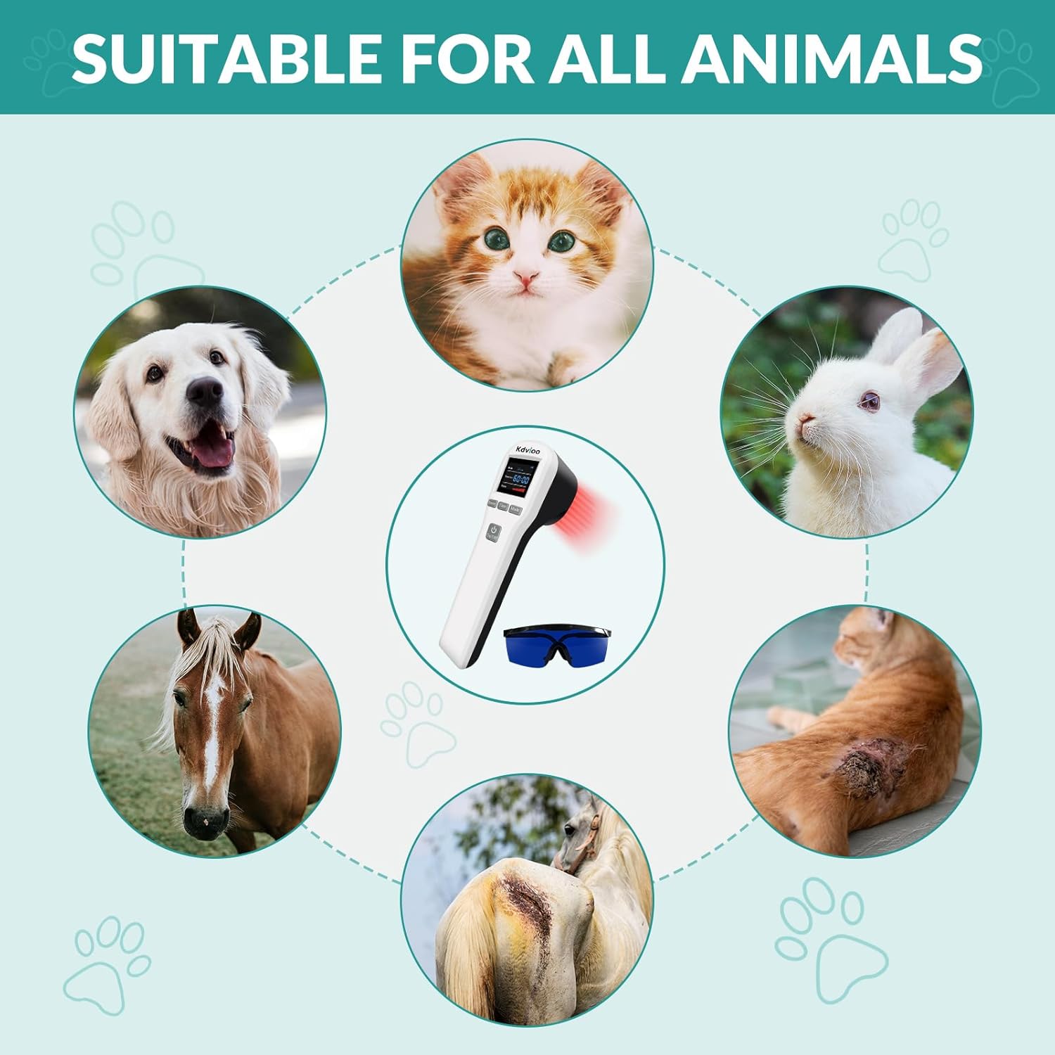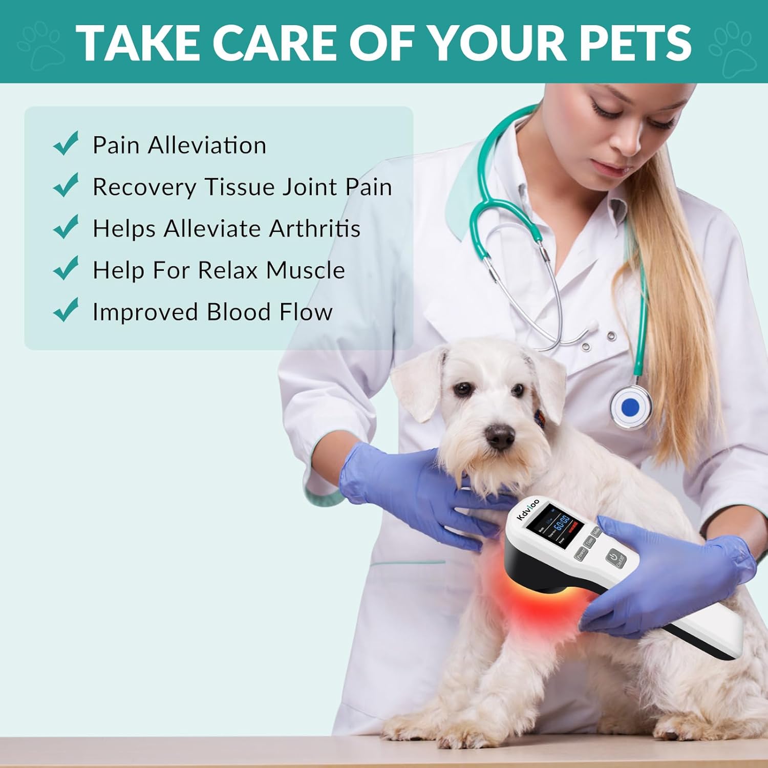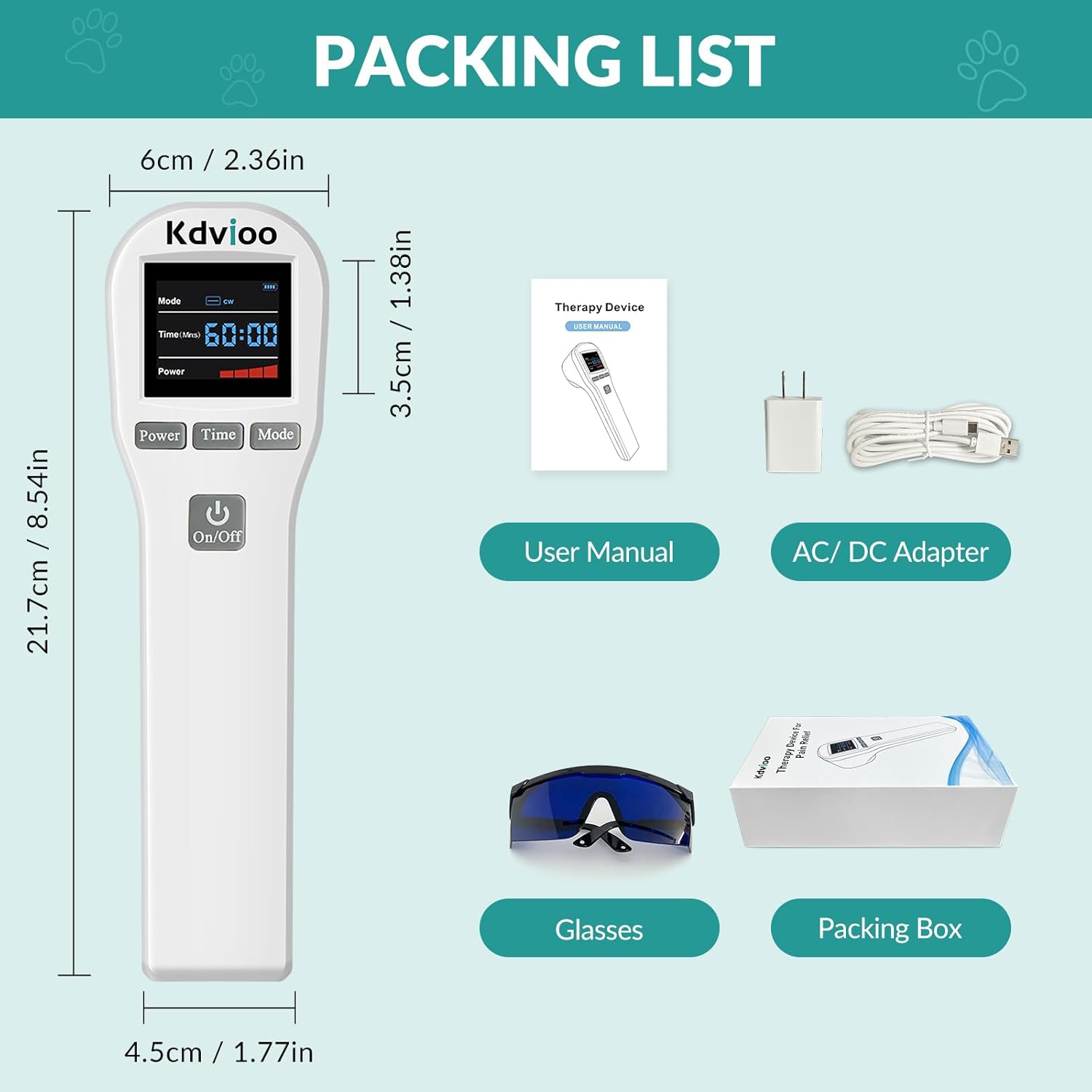 The Kdvioo Pet Cold Laser Therapy Device is designed specifically for pets, combining 4pcs of 808nm and 16pcs of 650nm lights to aid in pain relief. This device utilizes infrared light therapy, which penetrates deep into tissues and joints, making it beneficial for dogs suffering from arthritis and spinal pain. The 650nm red light enhances blood circulation, promoting healing.