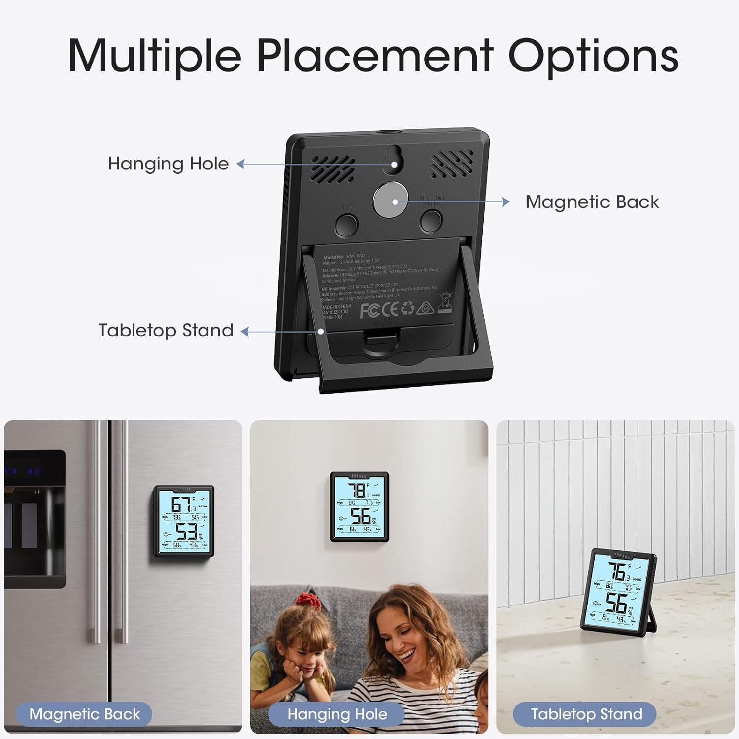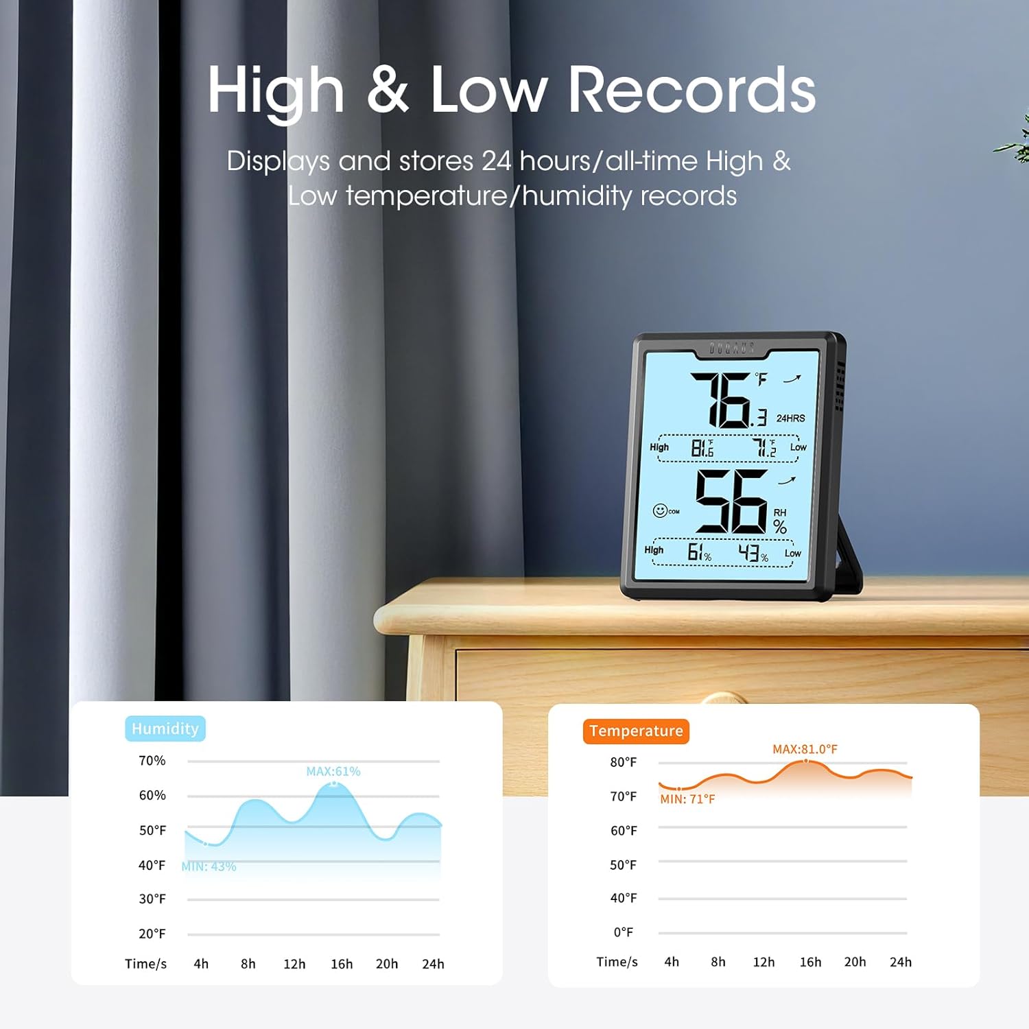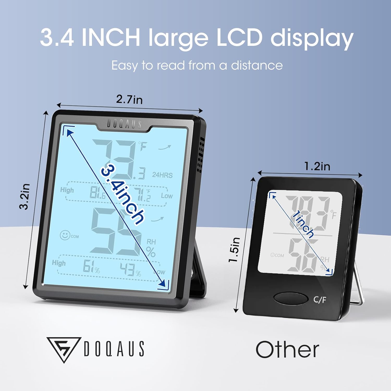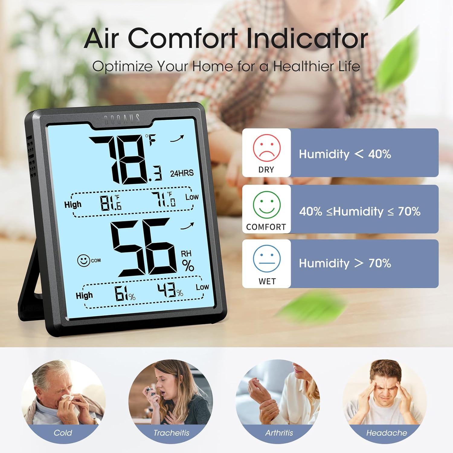 DOQAUS Digital Hygrometer Room Thermometer Indoor, Humidity Meter with Large LCD Display, Backlight Temperature Humidity Monitor with Max Min Records, Black