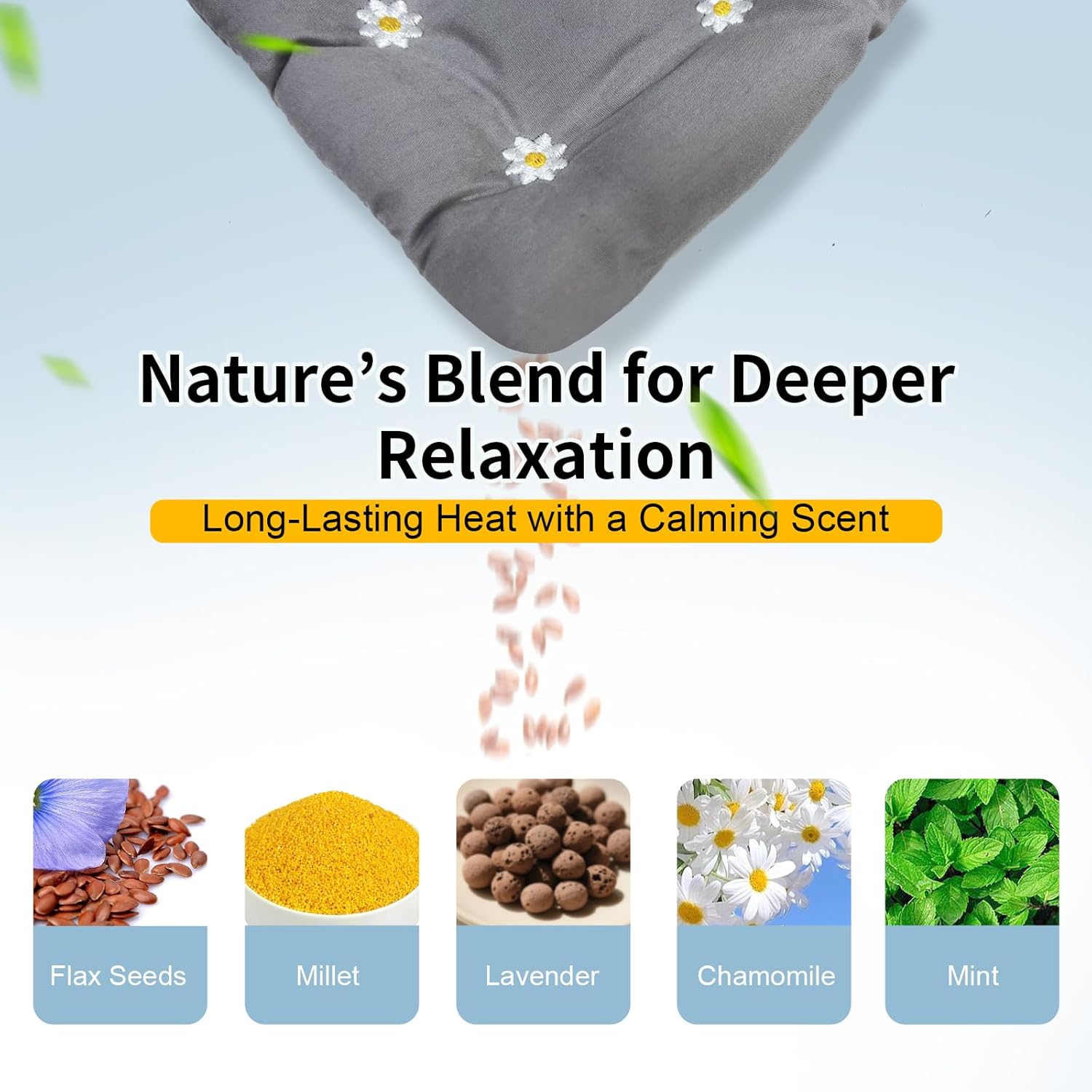 - Filled with a natural blend of flax seeds, lavender, and chamomile.