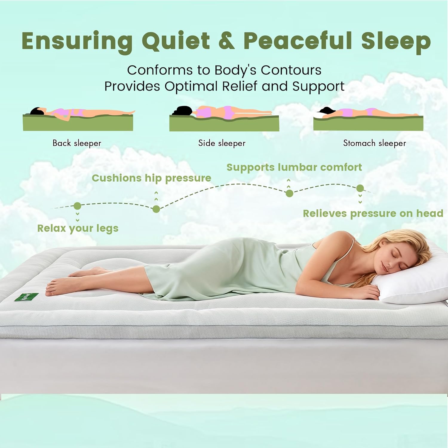 The mattress topper is available in 10 versatile sizes, including Twin, Twin XL, Sofa Full, Full, Sofa Queen, Short Queen, Queen, RV King, King, and California King.
