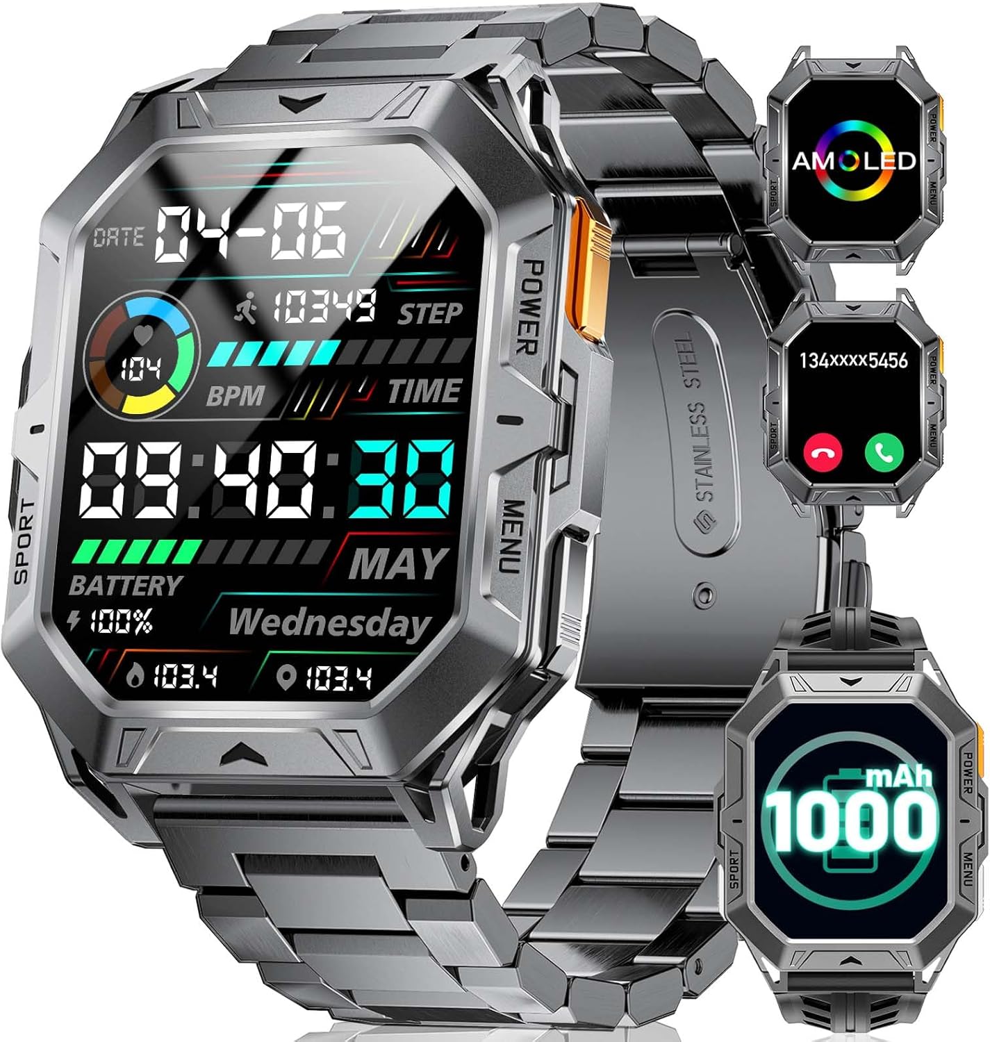 The HIRREO military smart watch is designed for men who enjoy outdoor activities. With a rugged construction made from high-strength metal, it is built to endure tough conditions. The watch features a 2.13'' AMOLED HD display with a resolution of 410×750 pixels, providing clear visuals. It is also IP68 waterproof, allowing it to function normally even at depths of 50 meters, making it suitable for swimming.