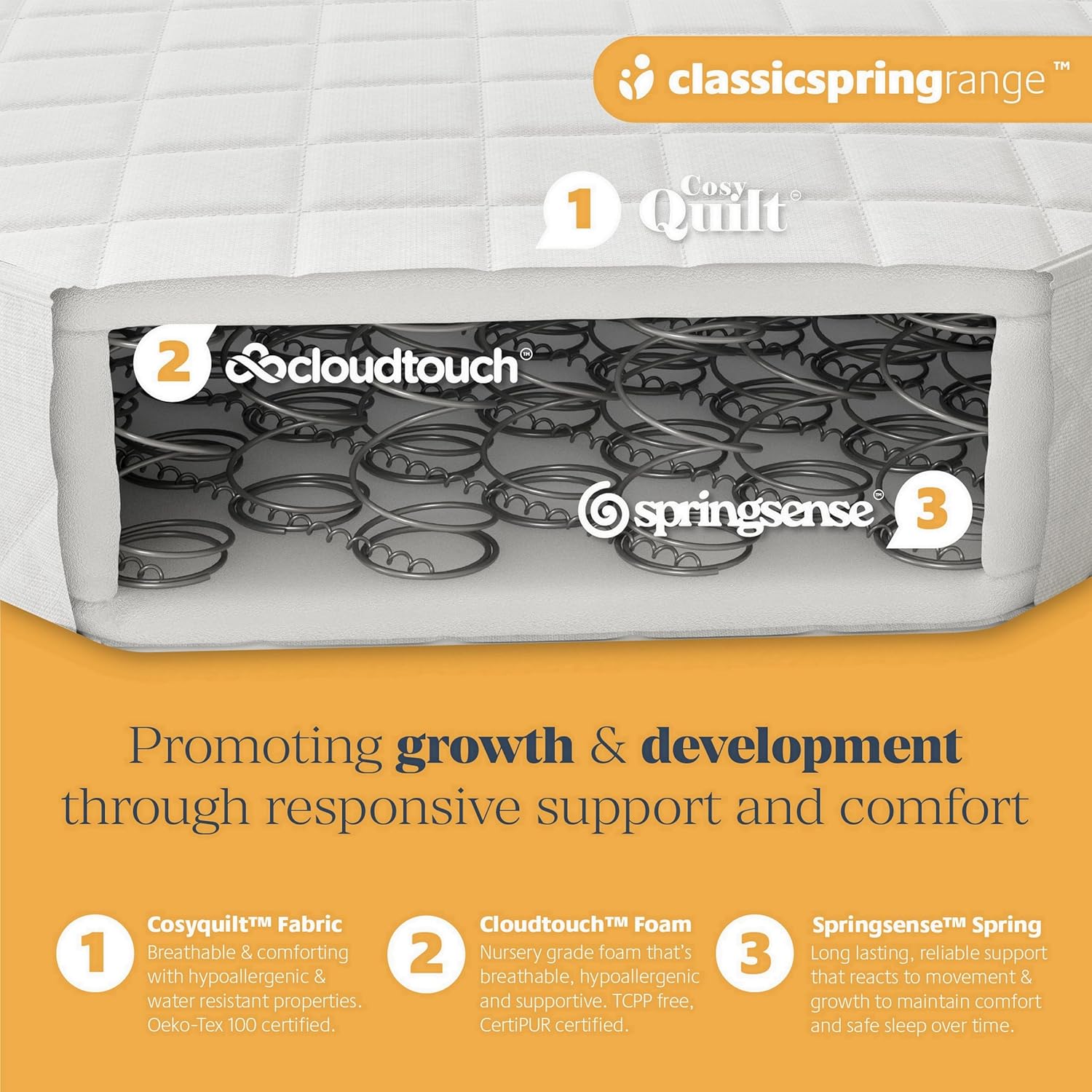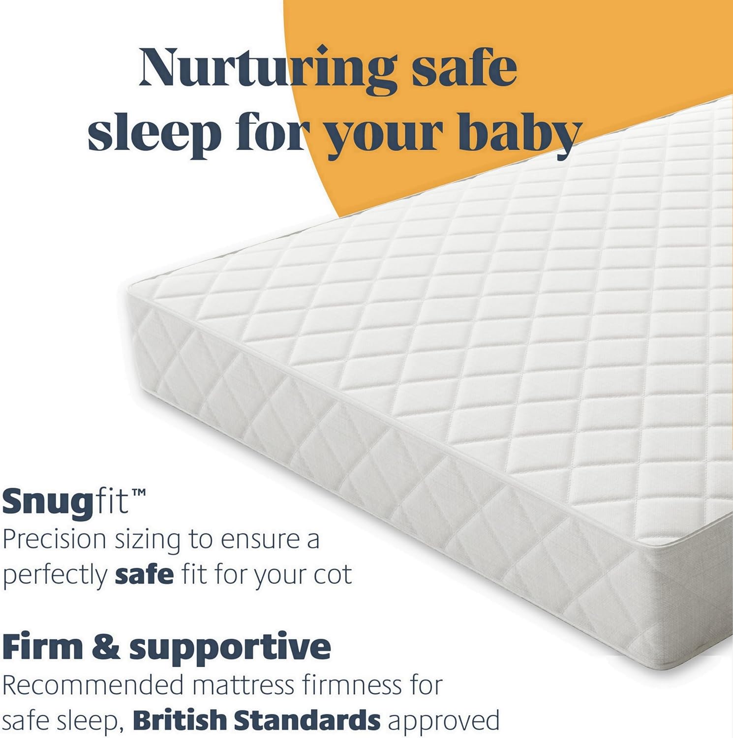 The MOTHER NURTURE Space Saver Spring Cot Mattress is designed to provide a safe and comfortable sleeping environment for your baby. Measuring 100 x 50 x 10cm, this mattress features a softly quilted Cosyquilt fabric that enhances comfort. Its nursery grade core offers firm support, which is recommended by sleep experts. The mattress is hypoallergenic and made from breathable materials, ensuring a healthy sleeping surface. Additionally, it is water resistant and can be easily wiped clean or washed at 40C for convenience.