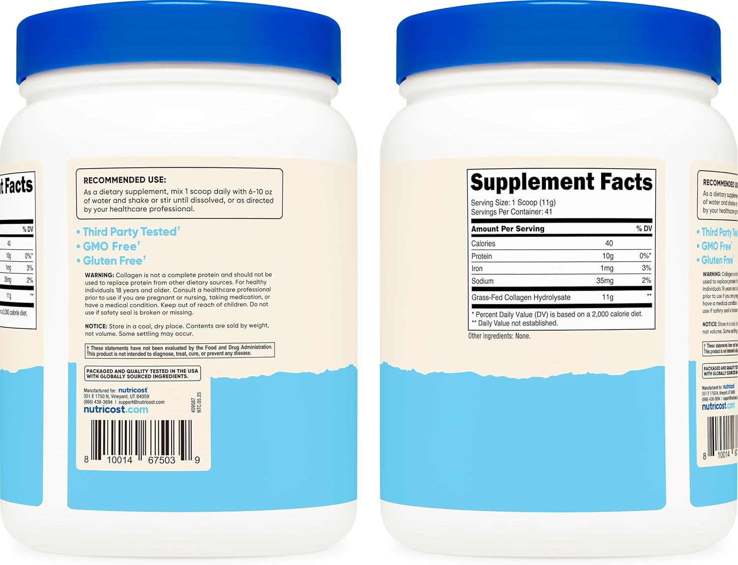 Nutricost Collagen Peptides Powder is made from grass-fed bovine collagen hydrolysate.