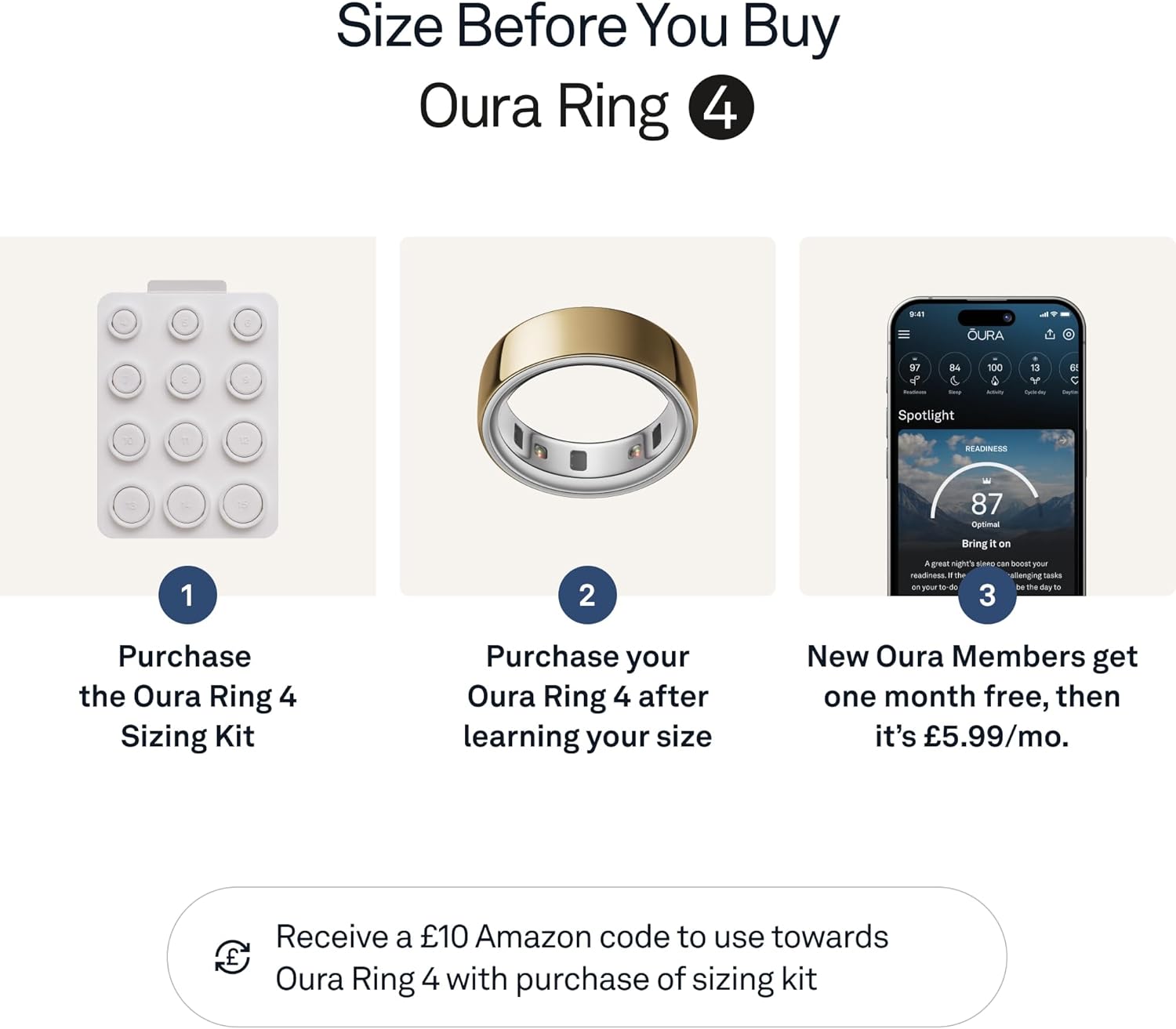 The OURA Ring 4 in Gold, Size 9, is a versatile smart ring designed to enhance your health and fitness journey. This sleek device not only tracks your sleep patterns but also monitors your heart rate and overall fitness levels. With a battery life of up to 8 days, it ensures that you can wear it continuously without frequent recharging. The included sizing kit helps you find the perfect fit, making it comfortable for daily wear.
