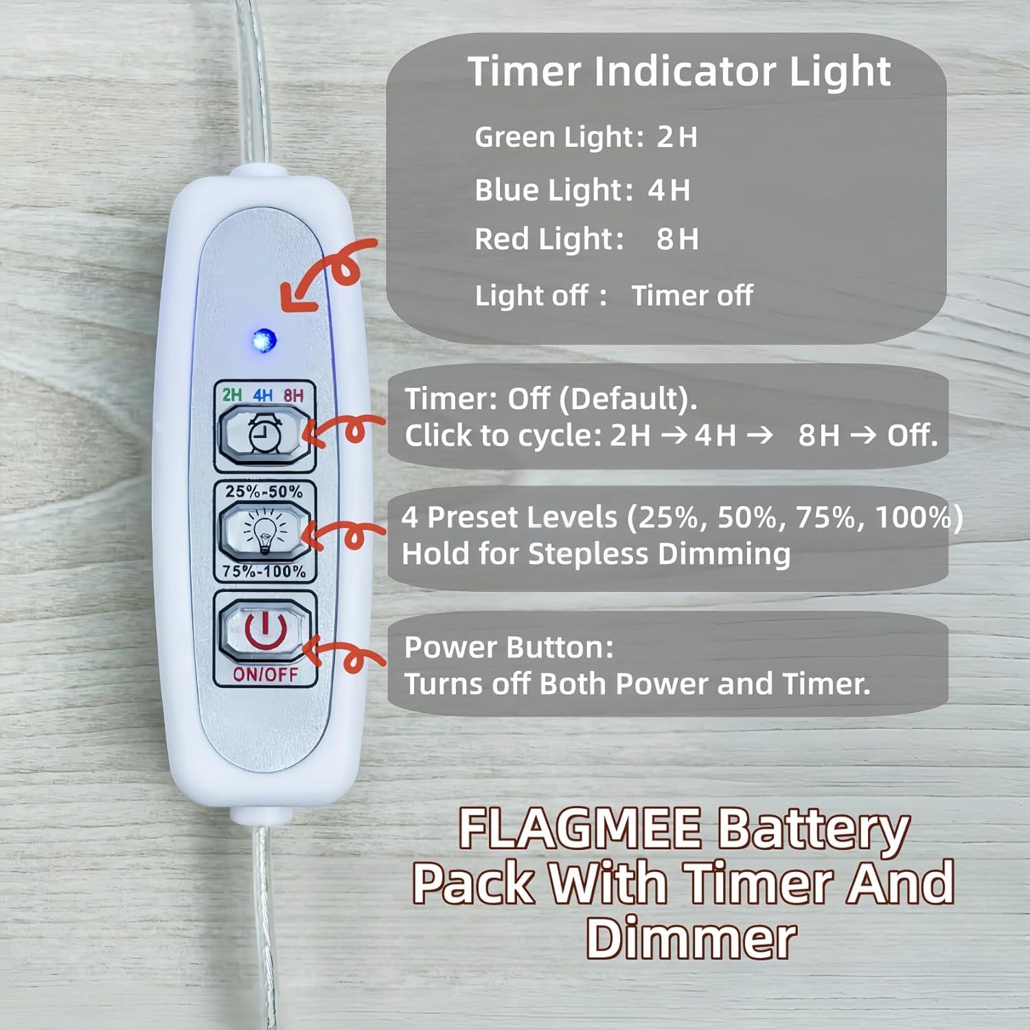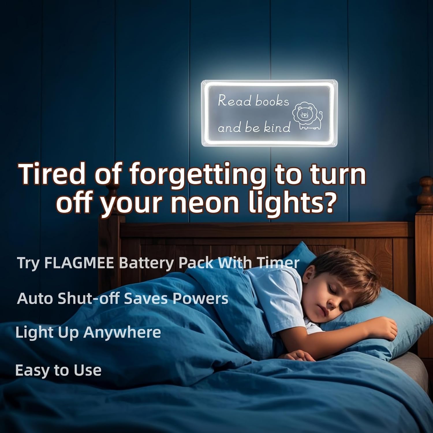 The FLAGMEE Portable Battery Pack is designed to enhance your lighting experience with convenience and flexibility. It supports 5V USB neon signs and LED lights, allowing you to set the perfect ambiance for any occasion. With a built-in smart timer, you can choose from 2, 4, or 8-hour shut-off cycles, ensuring your lights turn off automatically, which helps save battery life.