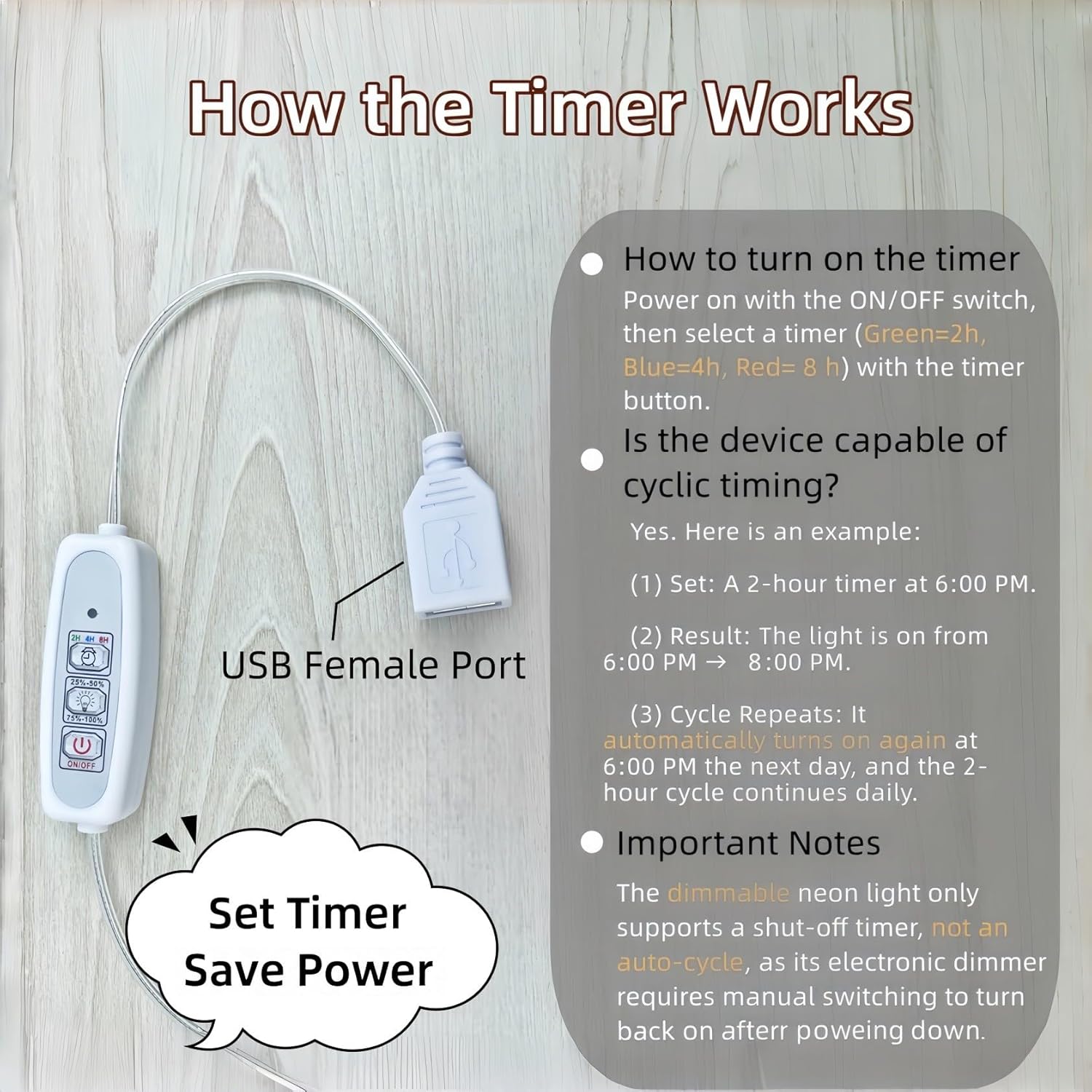 Portable Battery Pack With Timer for Neon Signs, 5V USB Battery Pack for Plug in Lights, Auto 2/4/8-Hour Shut-Off Cycle, Set Timer, Save Power
