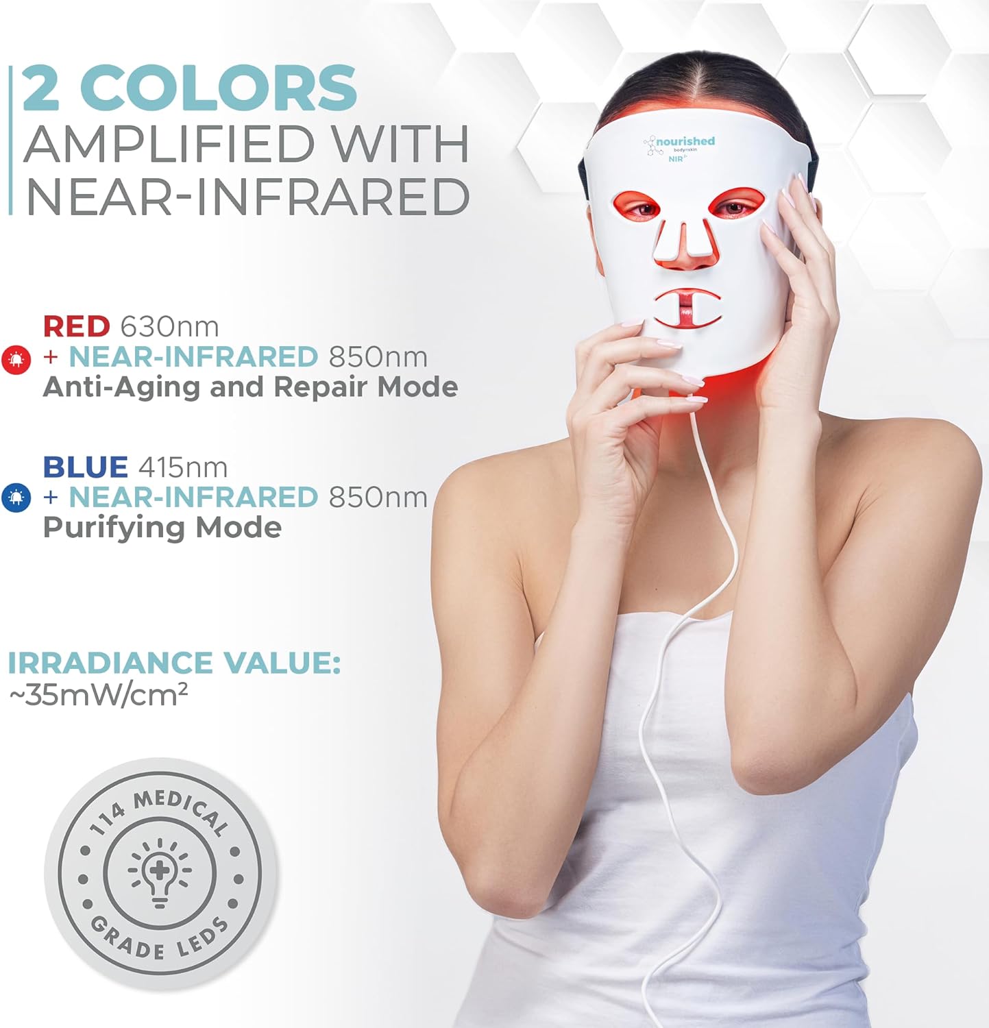 The Portable LED Face Mask with Near-Infrared is designed to enhance your skincare routine with its advanced light therapy technology. This mask features 114 LEDs that emit blue and red light, targeting wrinkles and signs of aging effectively. With a focus on simplifying skincare, this device is a great addition for those looking to achieve salon-quality results at home.