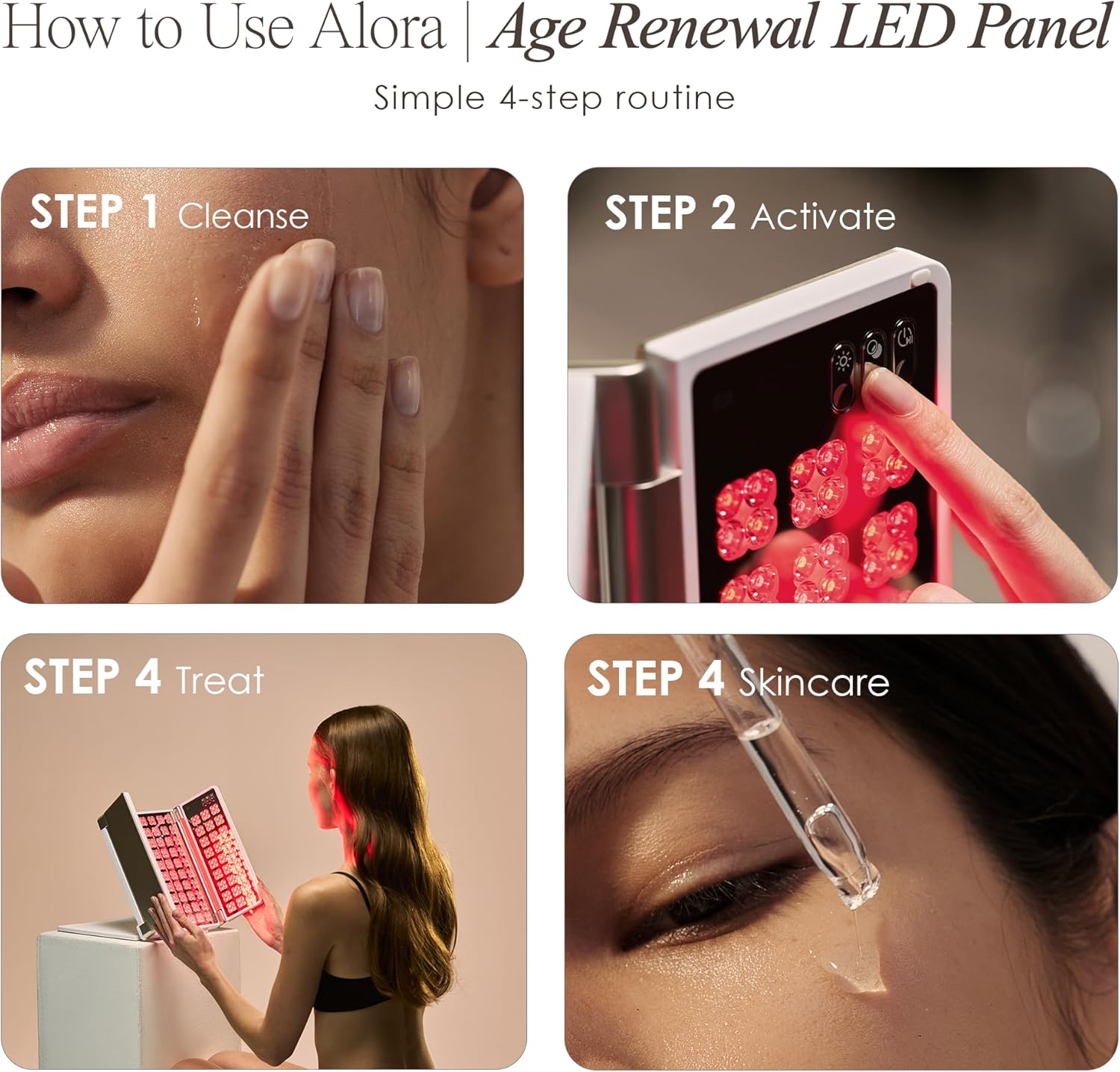 The Alora LED panel can help with various skin concerns, including signs of aging, fine lines, wrinkles, and overall skin rejuvenation.