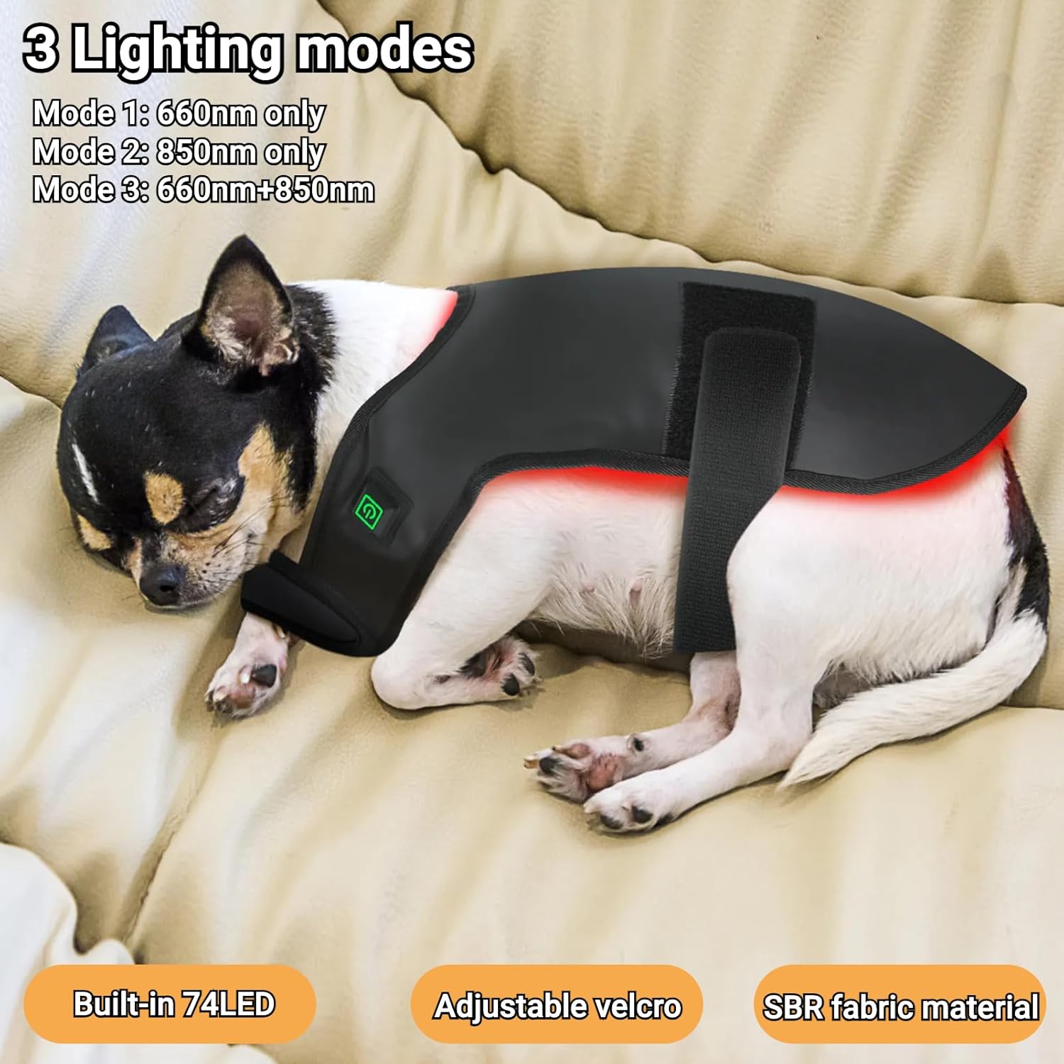 The Red Light Therapy Belt for Pets is designed to help relieve pain for various animals, including dogs, horses, and cats. This adjustable back brace utilizes advanced red light therapy technology to target discomfort effectively. The device features a rated power of 12W/15W/18W and operates at a voltage of 3.7V. It includes two types of LED chips with wavelengths of 660nm and 850nm, providing versatile treatment options.