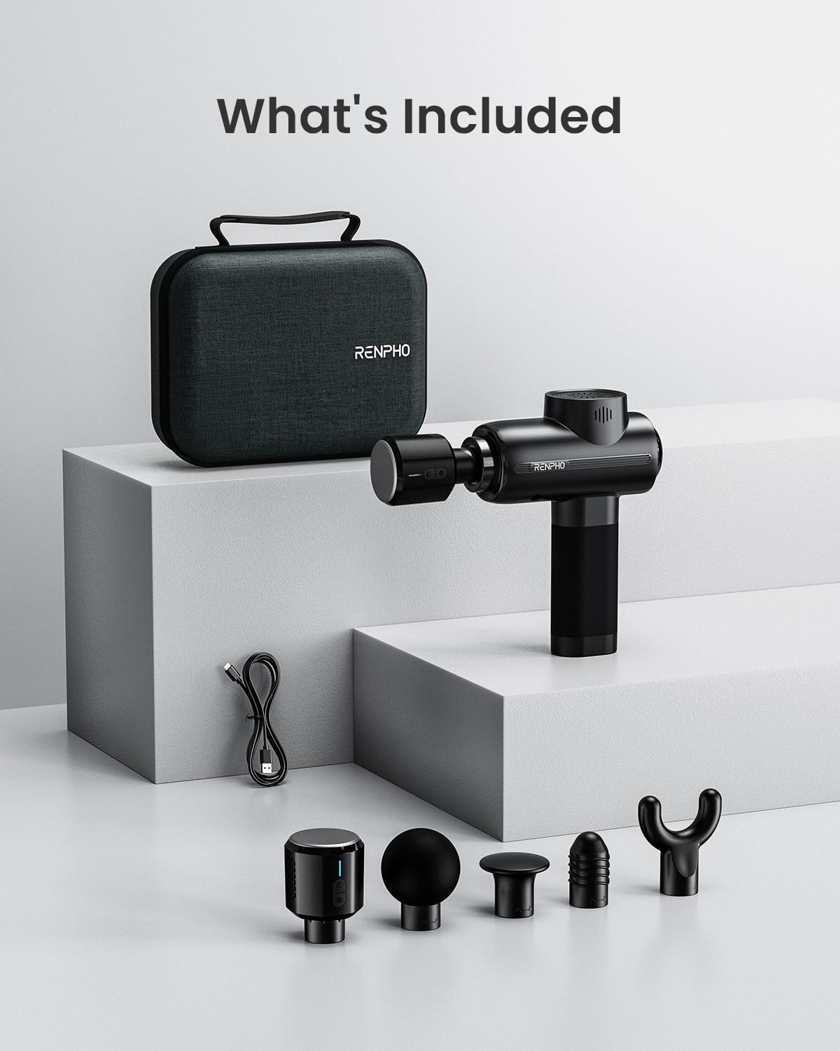 - Includes five massage heads for different muscle groups