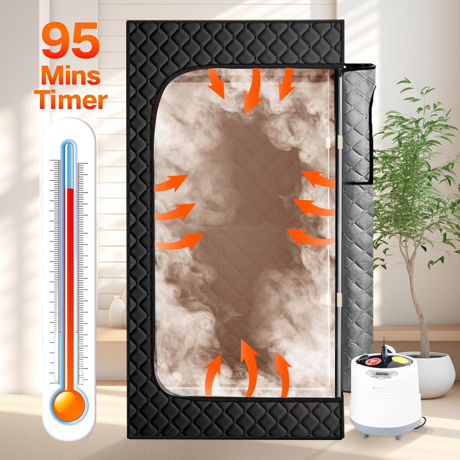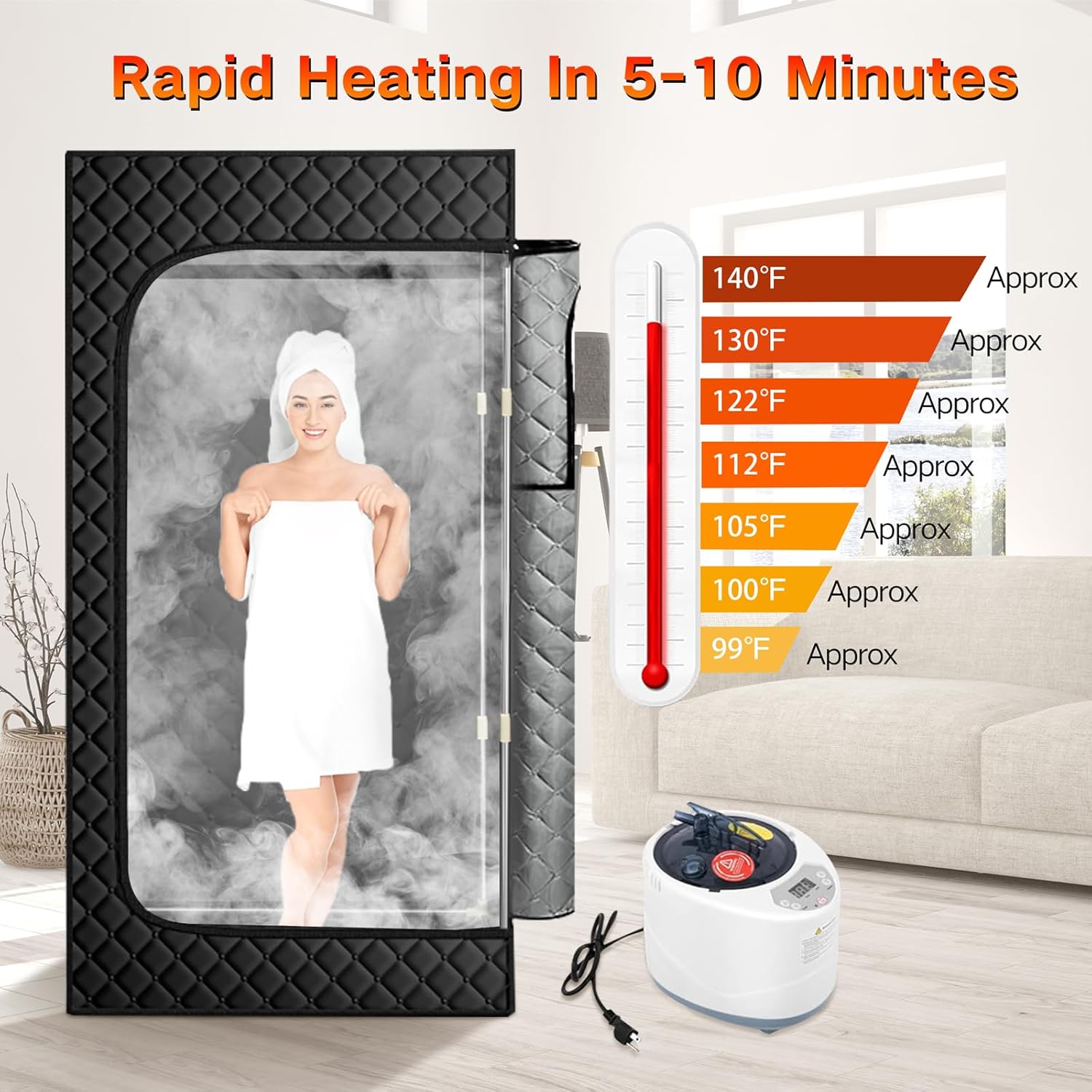 This sauna includes a 2.6-liter capacity steamer equipped with a remote control for convenient operation. With nine temperature settings, it can reach between 104°F and 140°F. The steamer heats up quickly, taking only 10-15 minutes to prepare, and maintains a high humidity level of 99% for an effective steam experience.