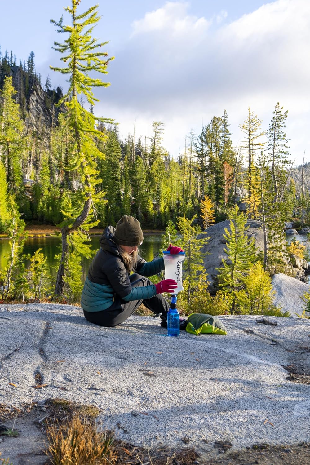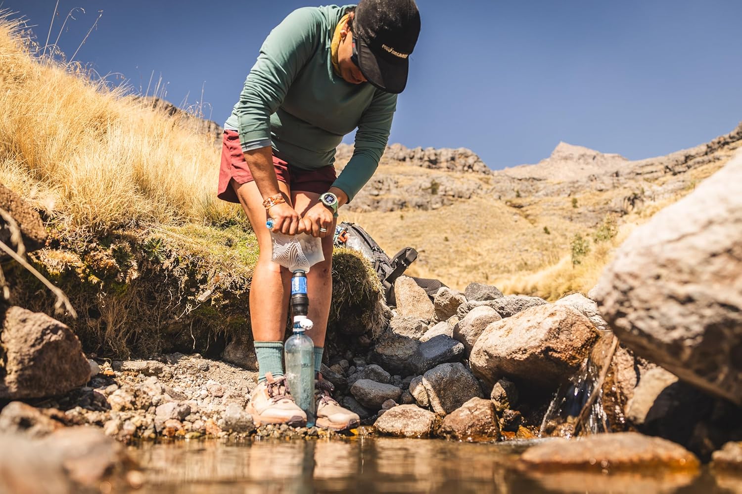 Simply fill the reusable pouch at any freshwater source, screw the filter onto the pouch, and drink directly from the filter or squeeze water into a bottle.