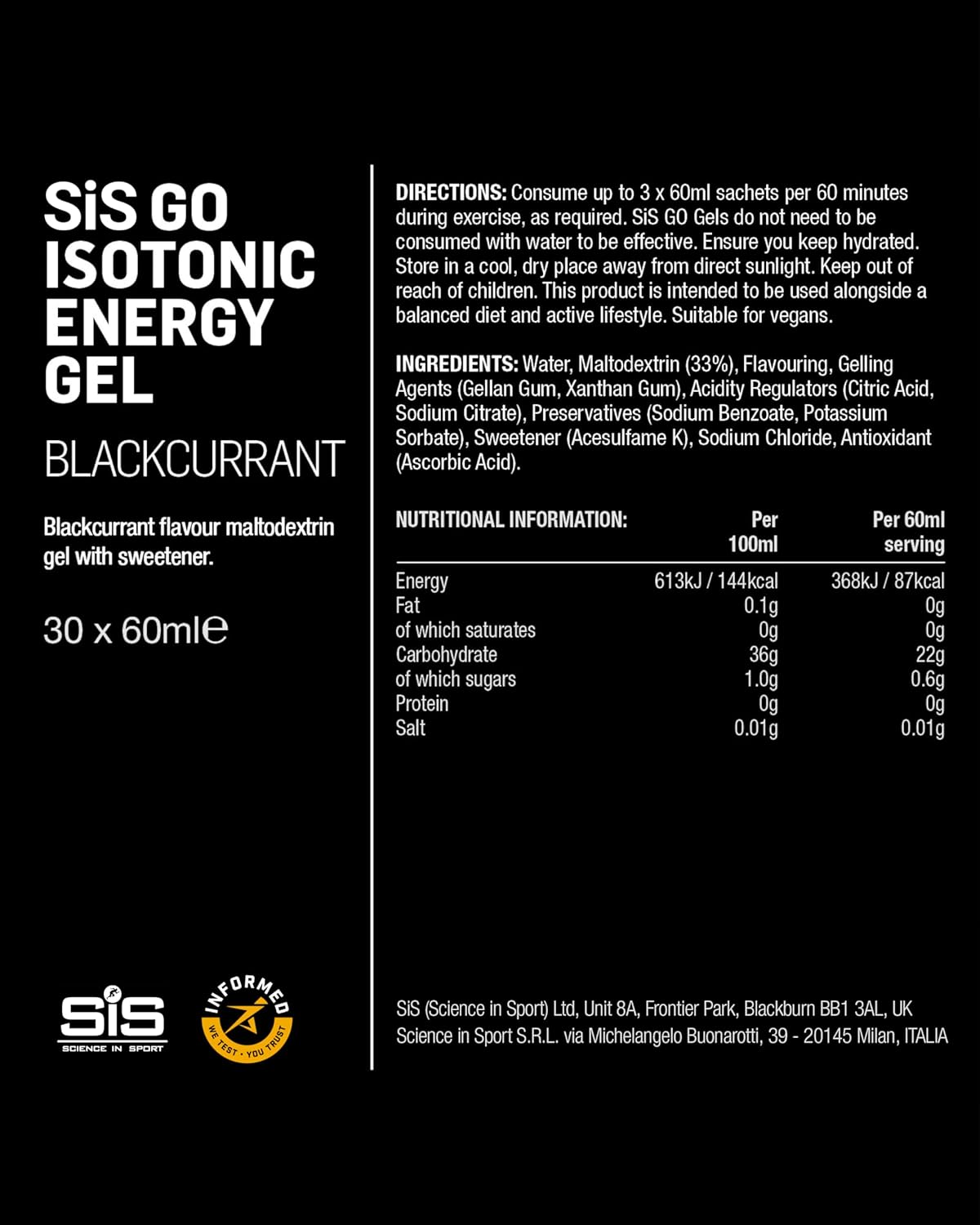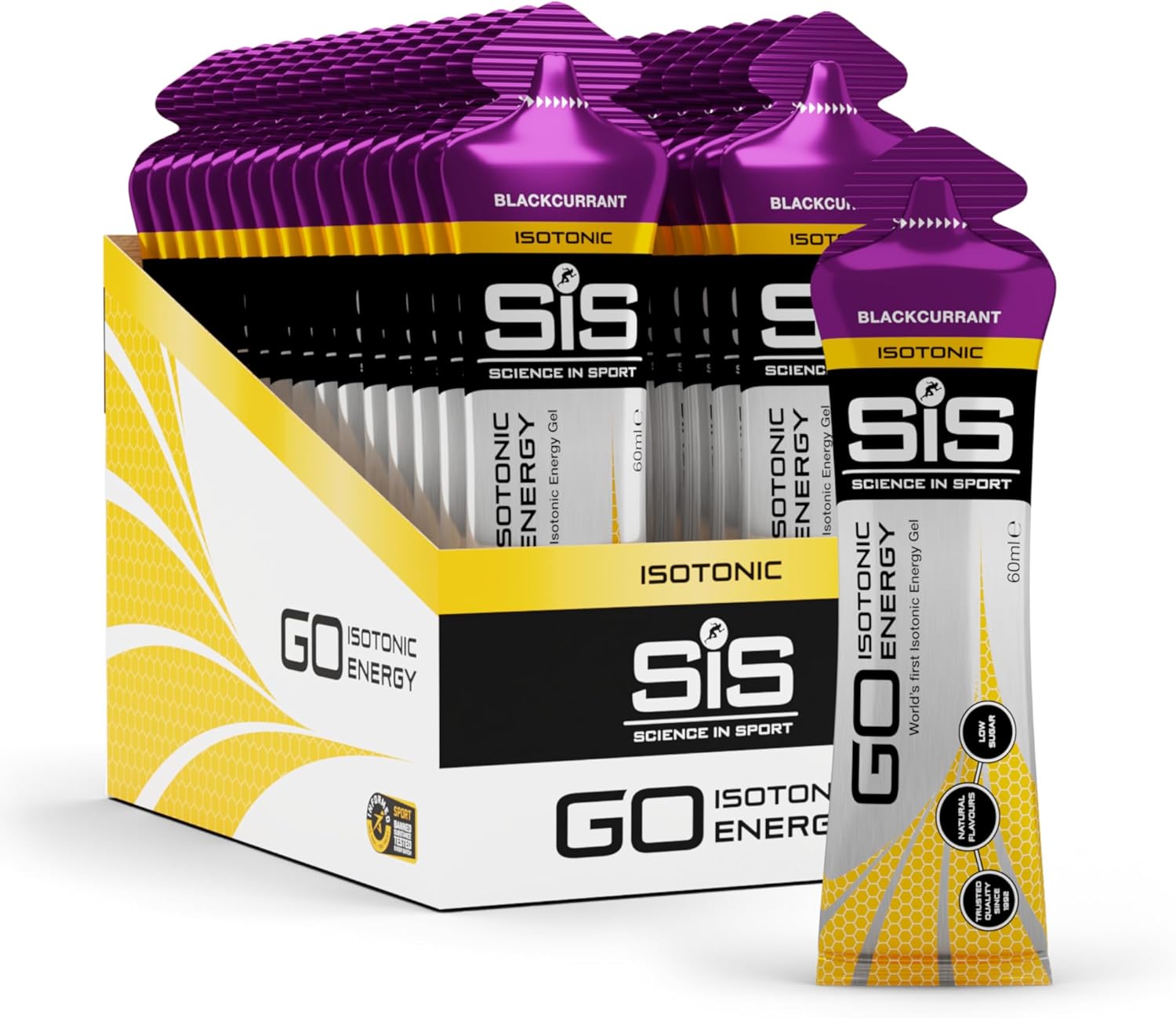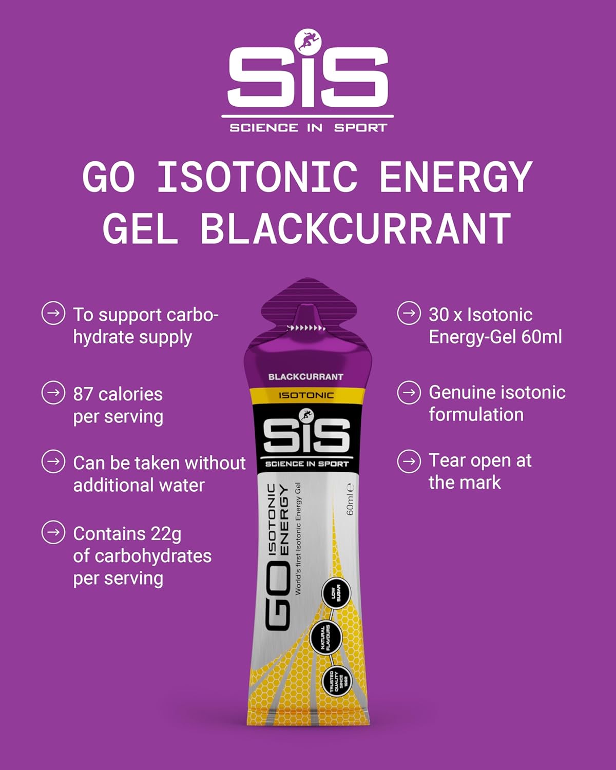 Science In Sport GO Isotonic Energy Gels, Running Gels with 22g Carbohydrates, Low Sugar, Blackcurrant Flavour, 60ml Per Serving (30 Pack)