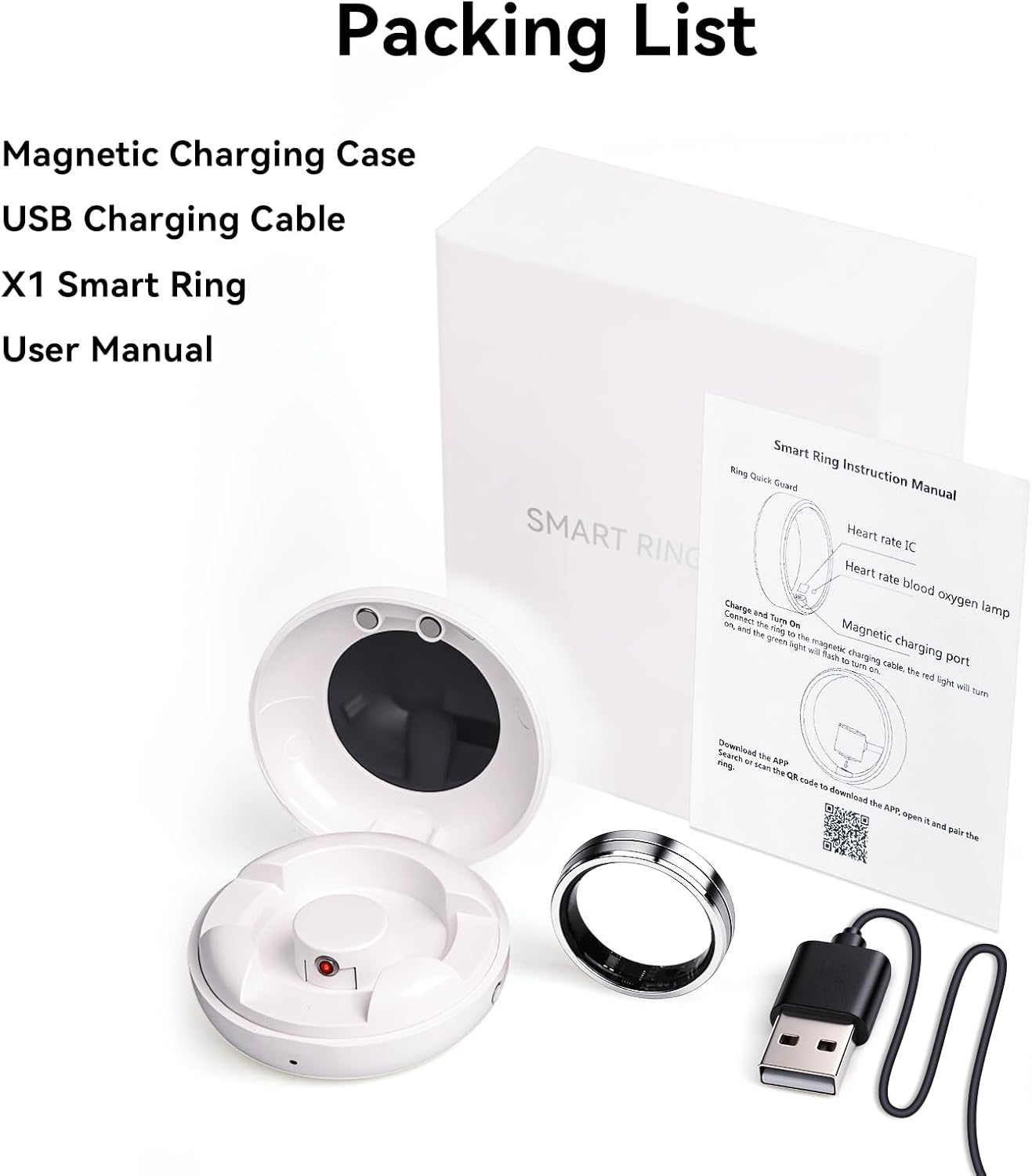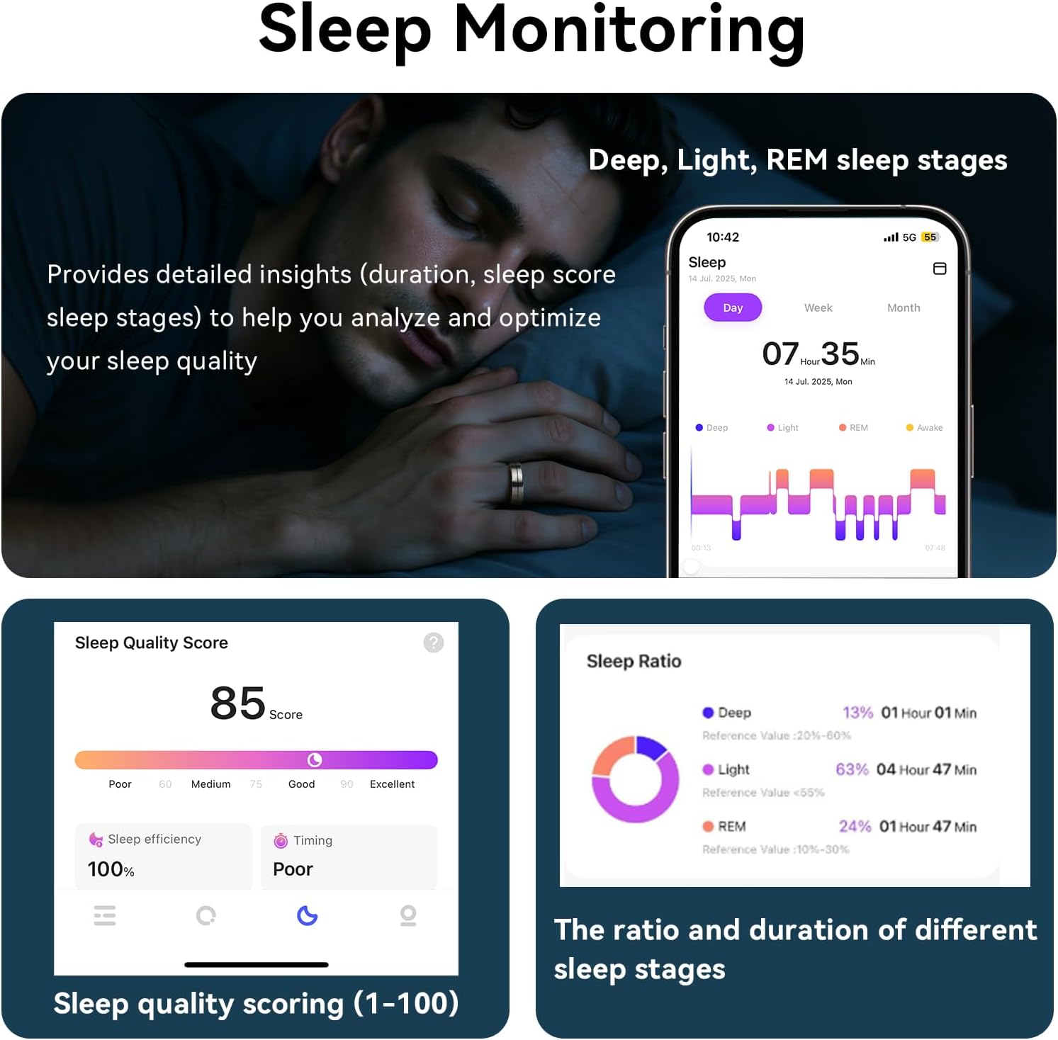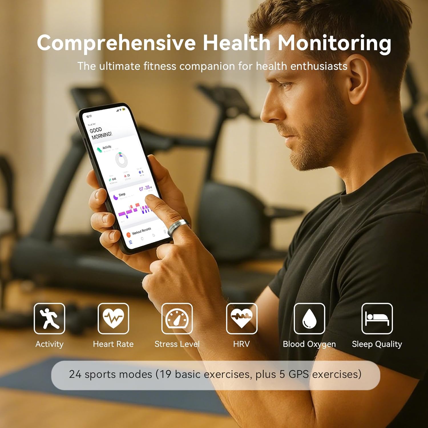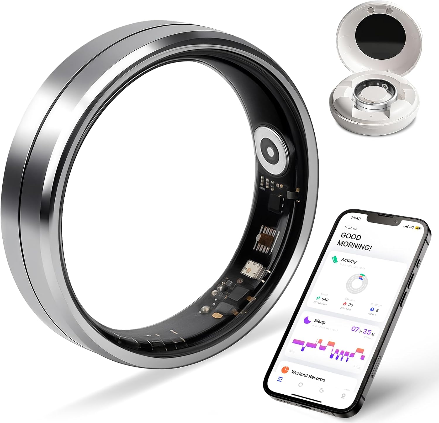 The Smart Ring tracks heart rate, blood oxygen levels, heart rate variability (HRV), stress levels, and sleep stages (deep, light, REM) using clinical-grade sensors.