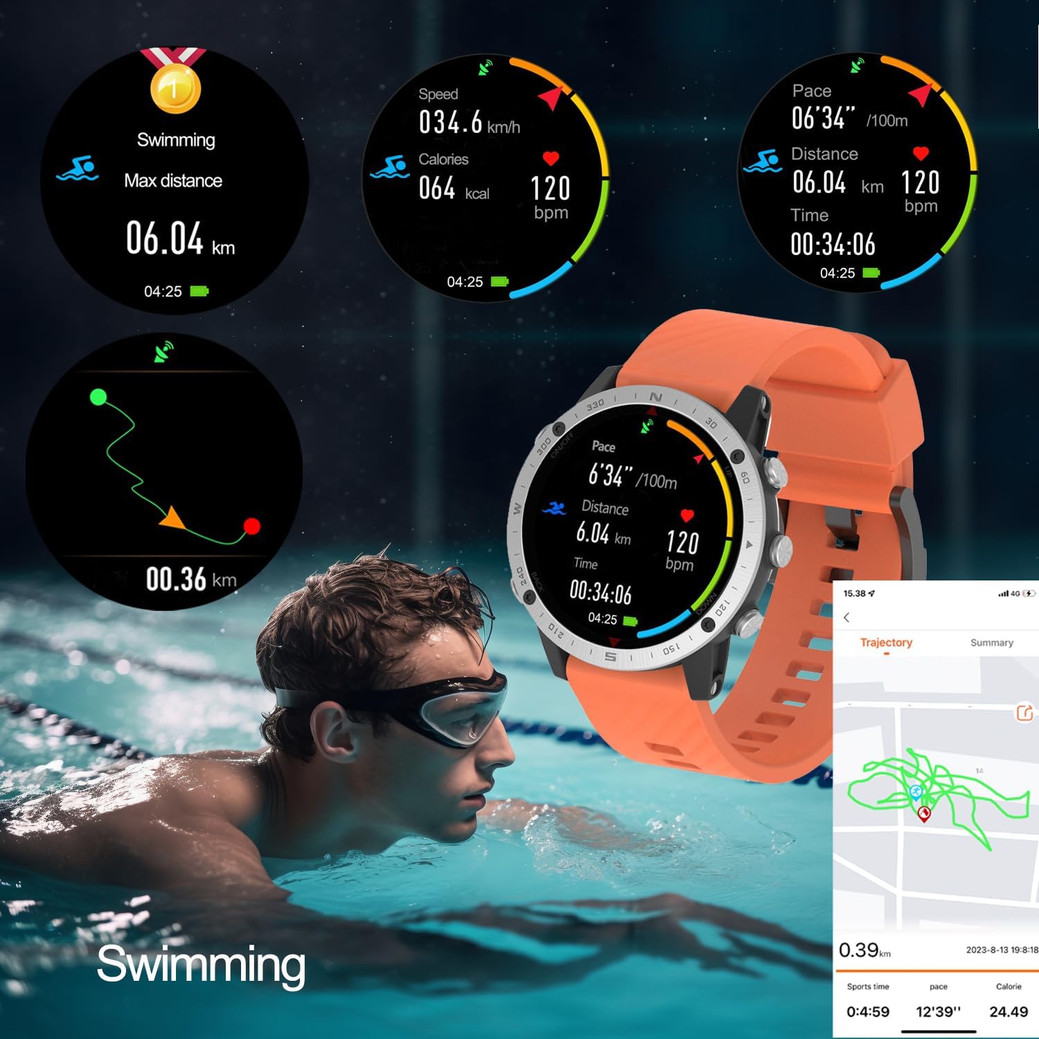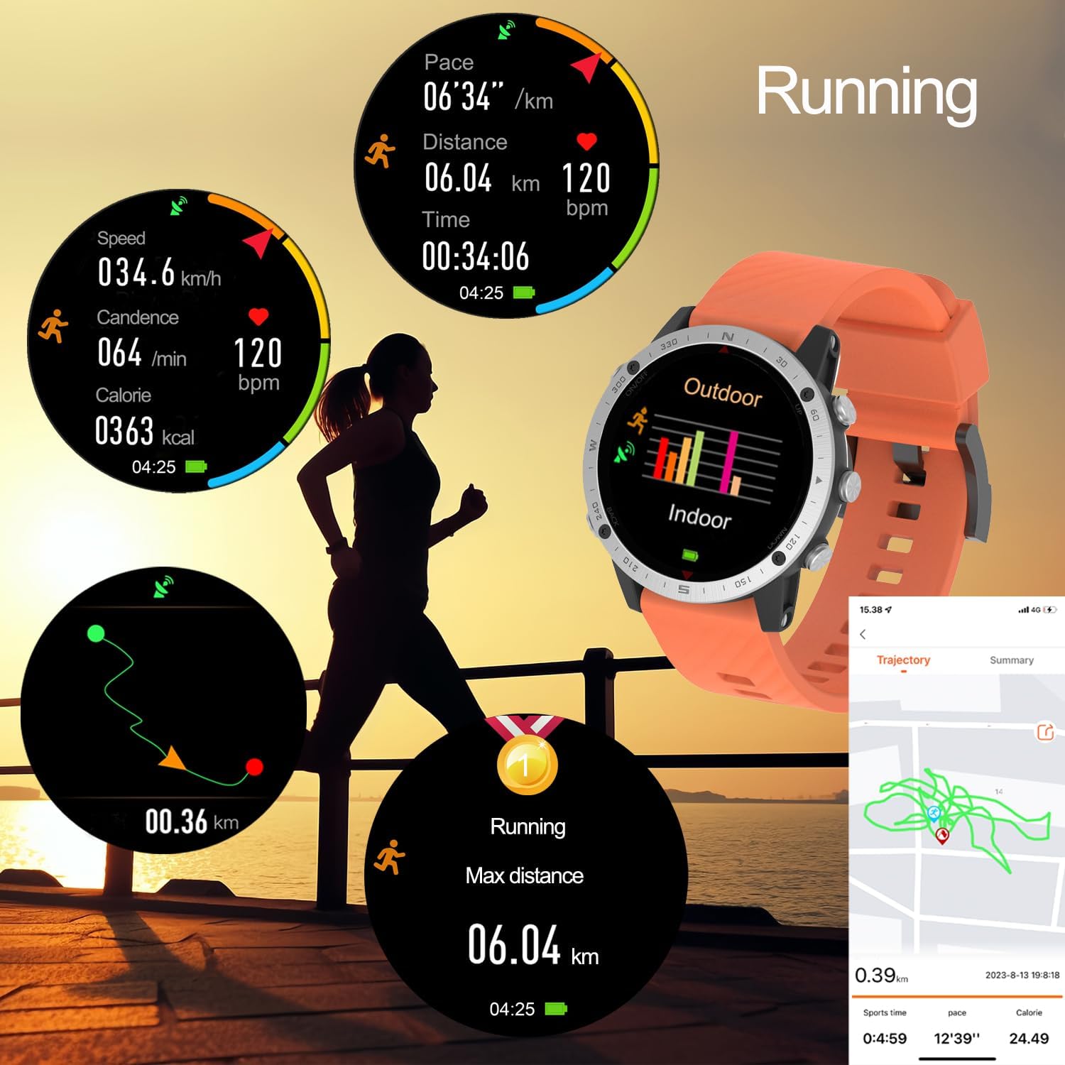 The watch provides data such as pace, calorie count, dynamic heart rate, sports time, steps, speed, distance, GPS route, and more.