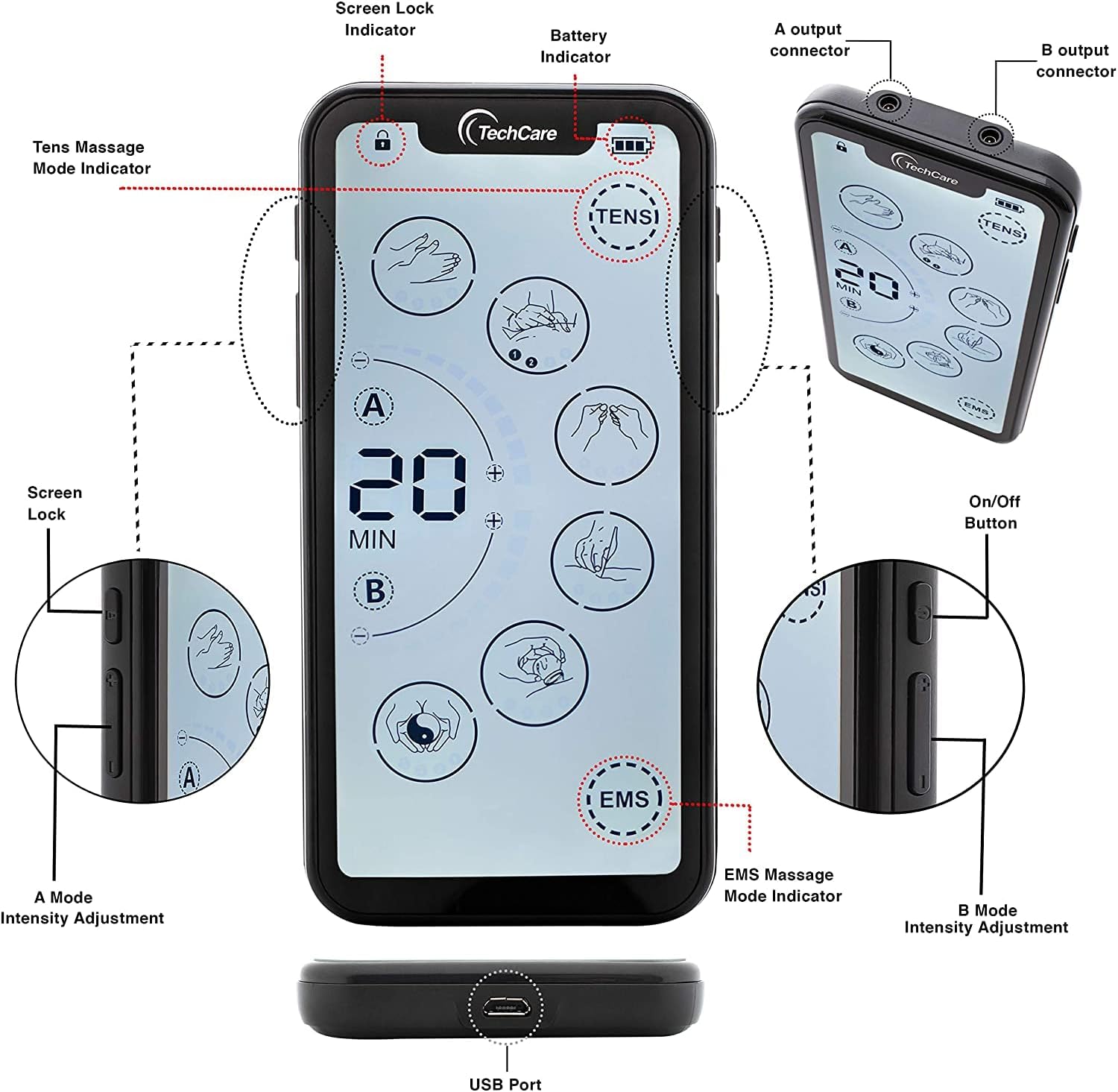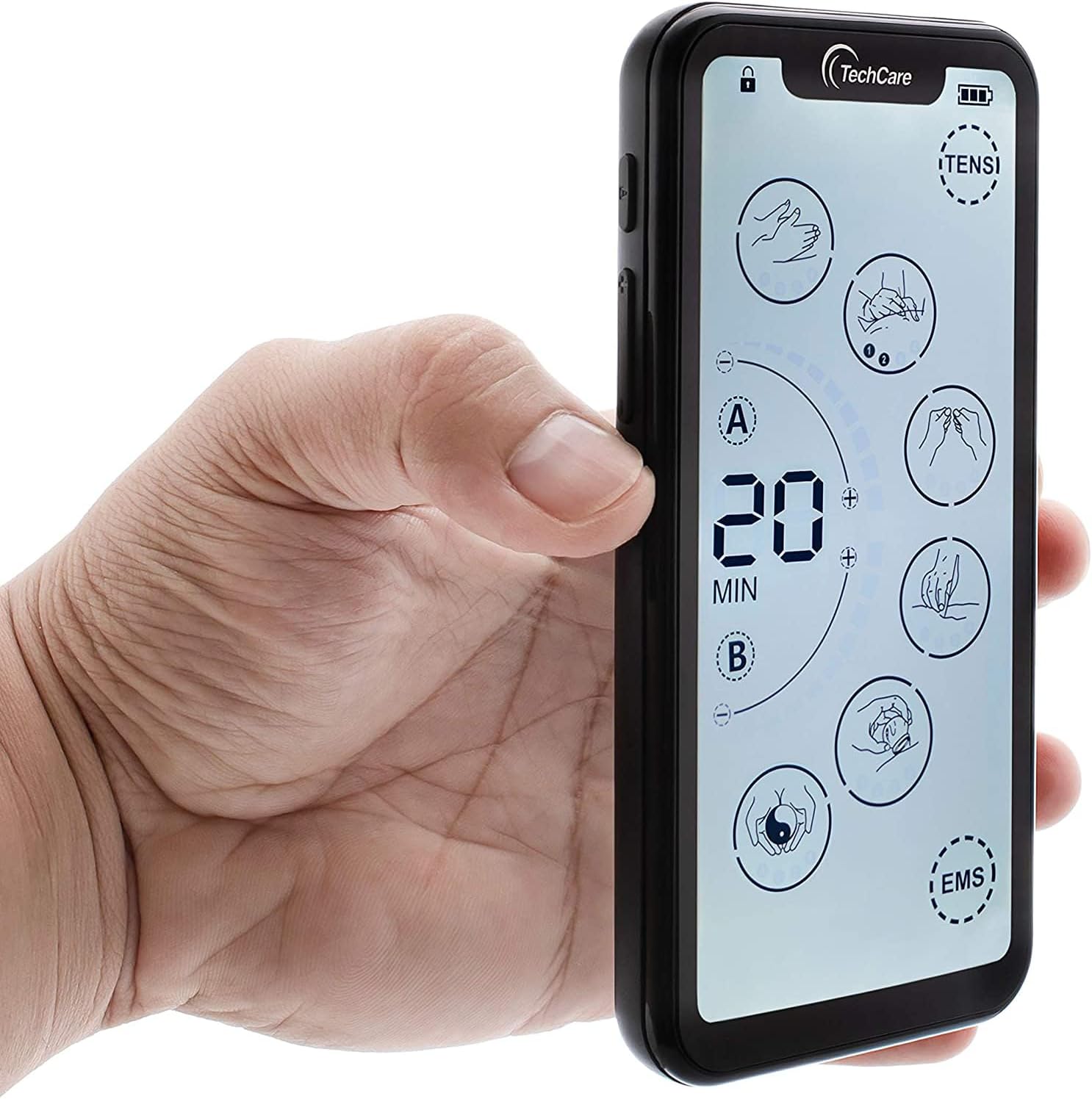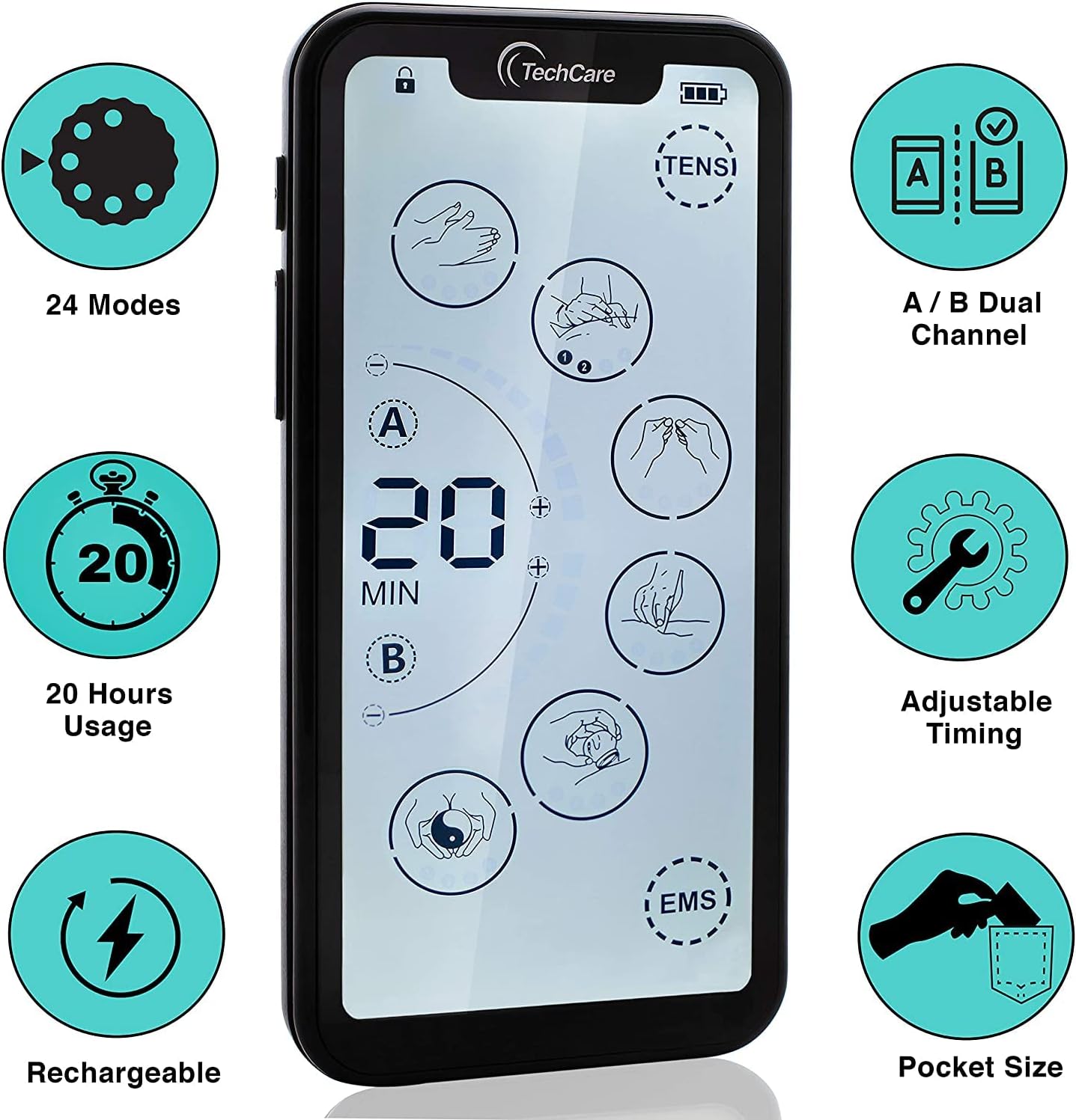 The TechCare Massager Muscle Stimulator is a dual-channel, battery-powered device that functions as both a Transcutaneous Electrical Nerve Stimulator (TENS) and a Powered Muscle Simulator (PMS), featuring a touch screen and 24 modes.