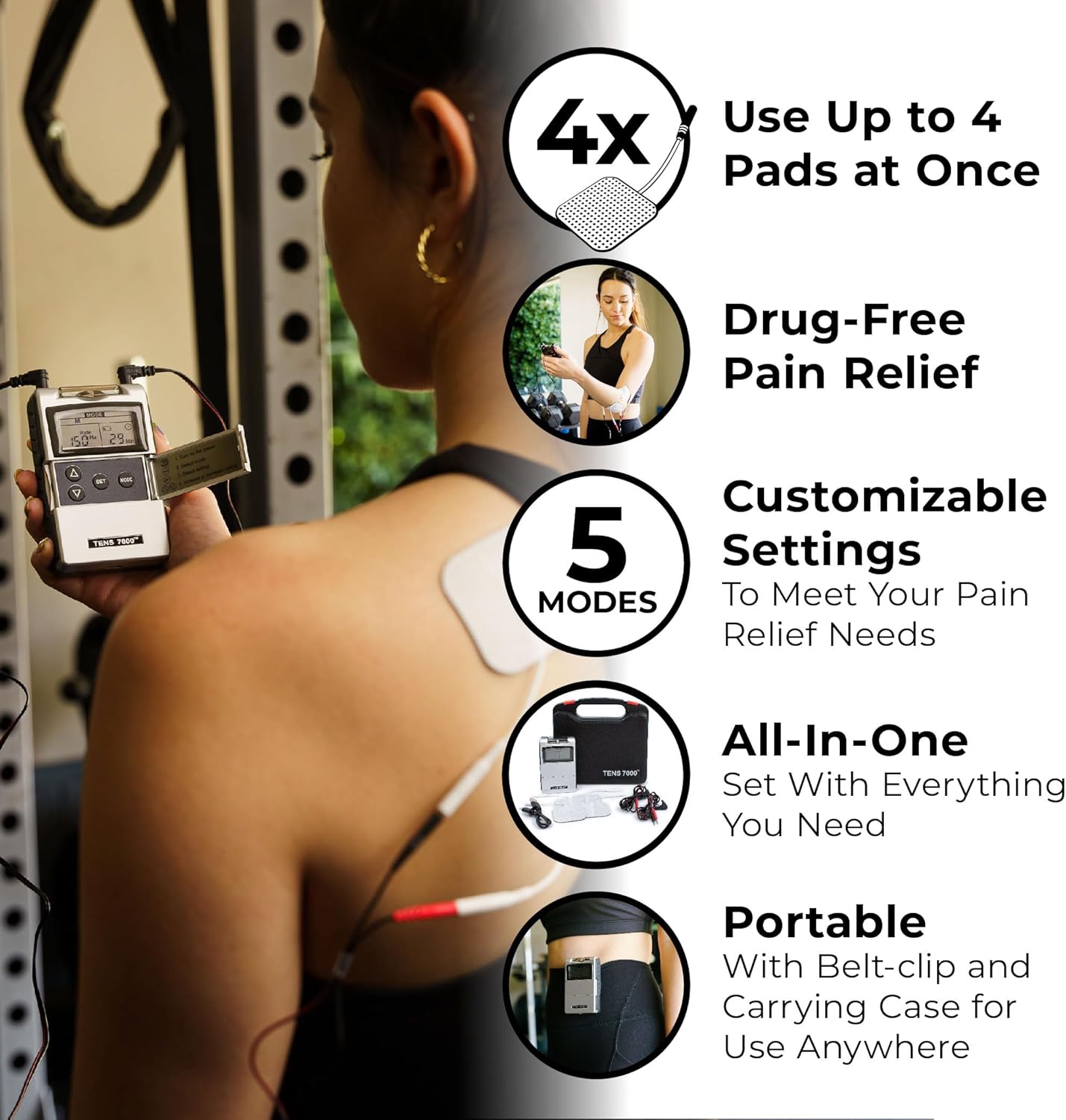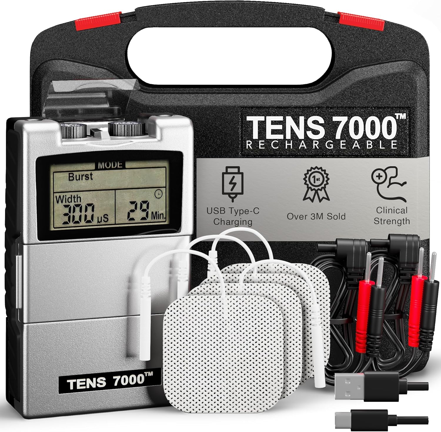 TENS 7000 Rechargeable Tens Unit Muscle Stimulator, Back Pain Relief, 4 Electrodes/Unit Pads, Period Pain Simulator, Muscle Recovery & Growth, Stim Machine, Electrotherapy, TENS Machine