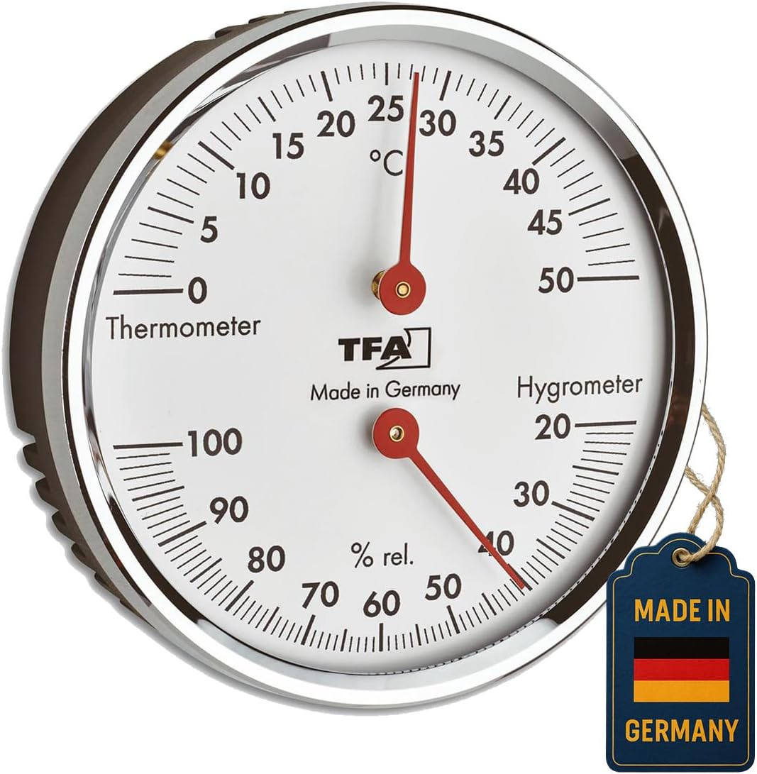 TFA Dostmann 45.2041.42 Analogue Thermo-Hygrometer with Metal Ring for Temperature and Humidity Control, Silver, L120 x W29 x H235 mm