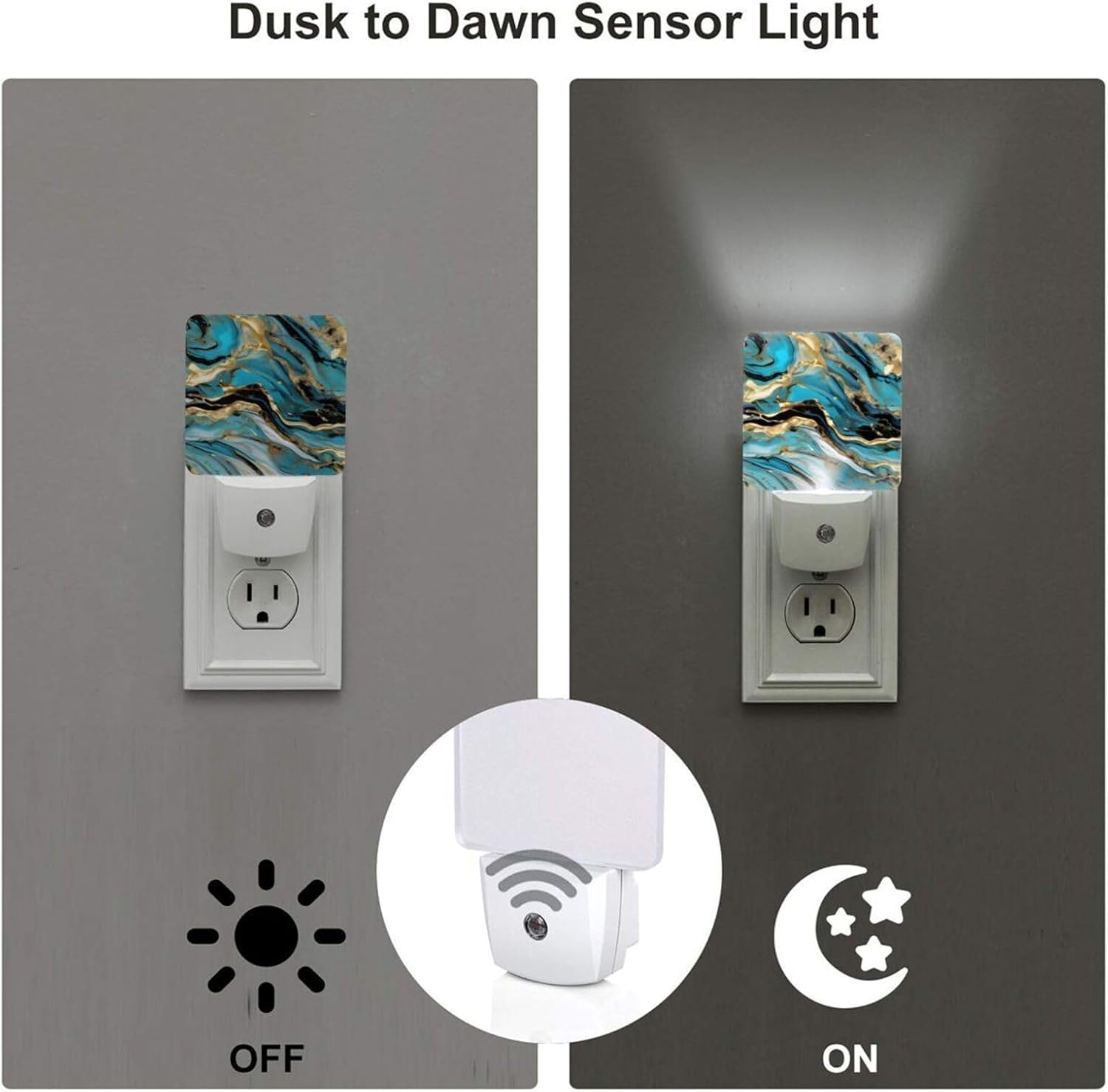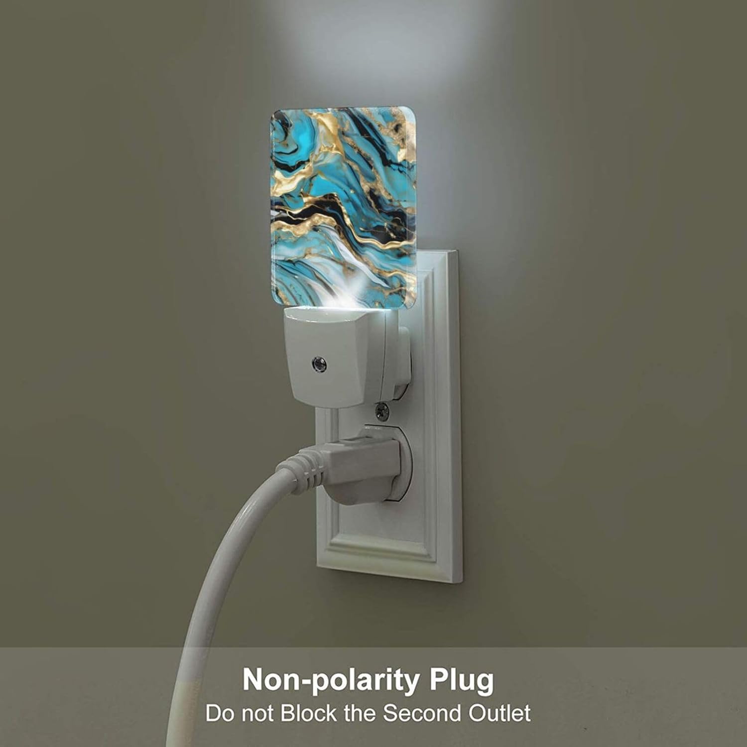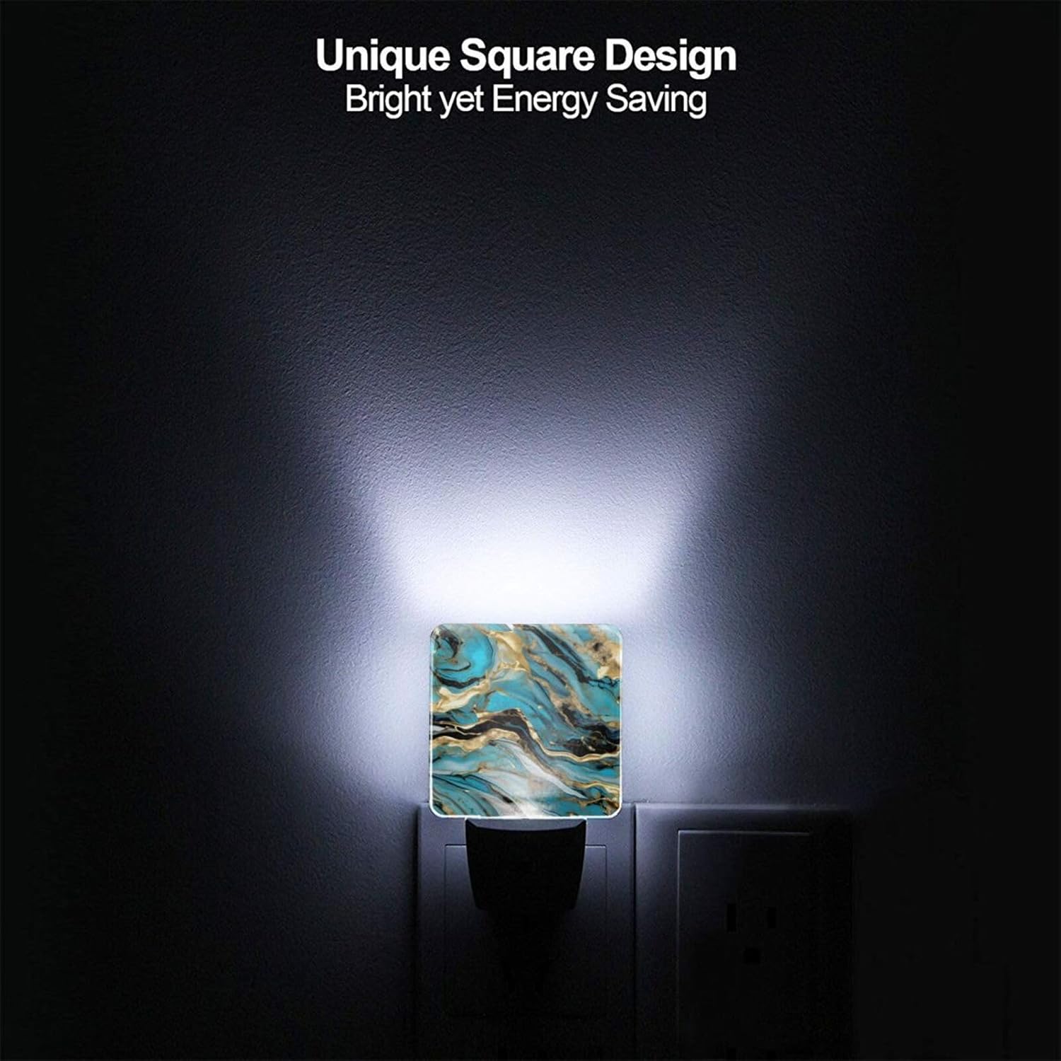 Enhance your home's comfort and safety with the Turquoise Blue Gold Marble Print Night Light. This compact, sensor-activated LED night light is designed for effortless plug-in use, providing soft, glare-free illumination in a warm white tone. It automatically turns on in the dark and off at sunrise, ensuring maximum efficiency without any hassle.