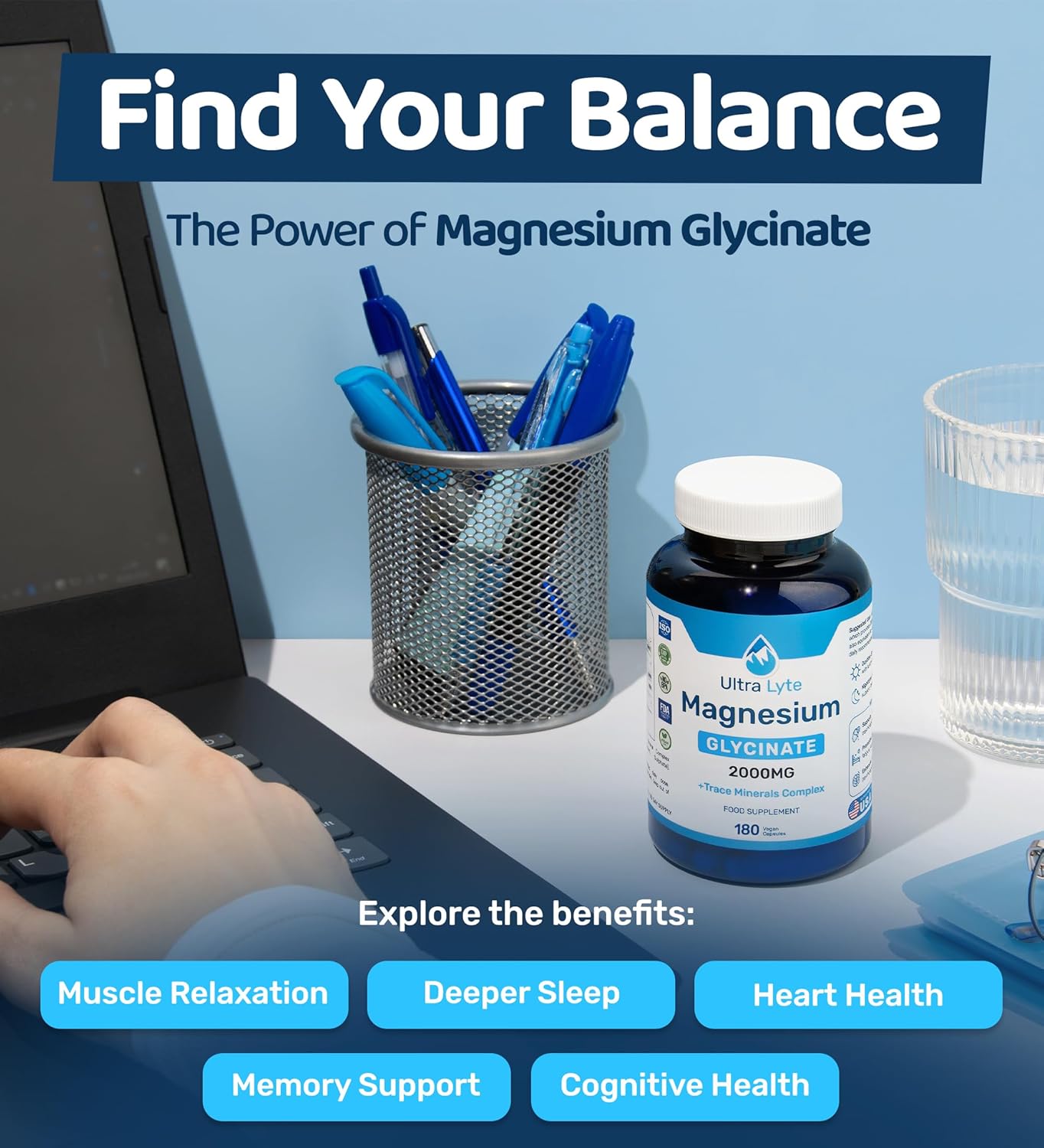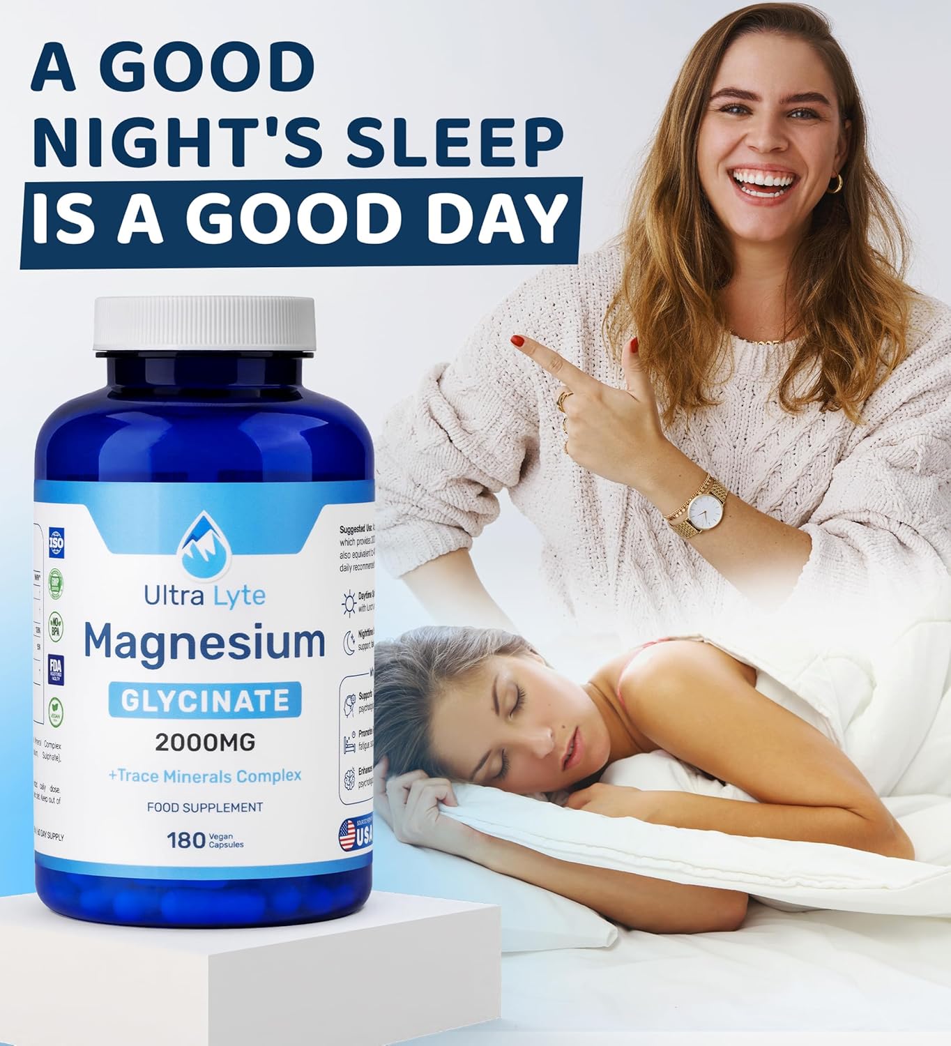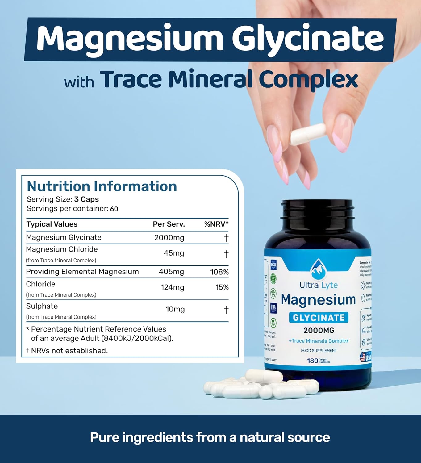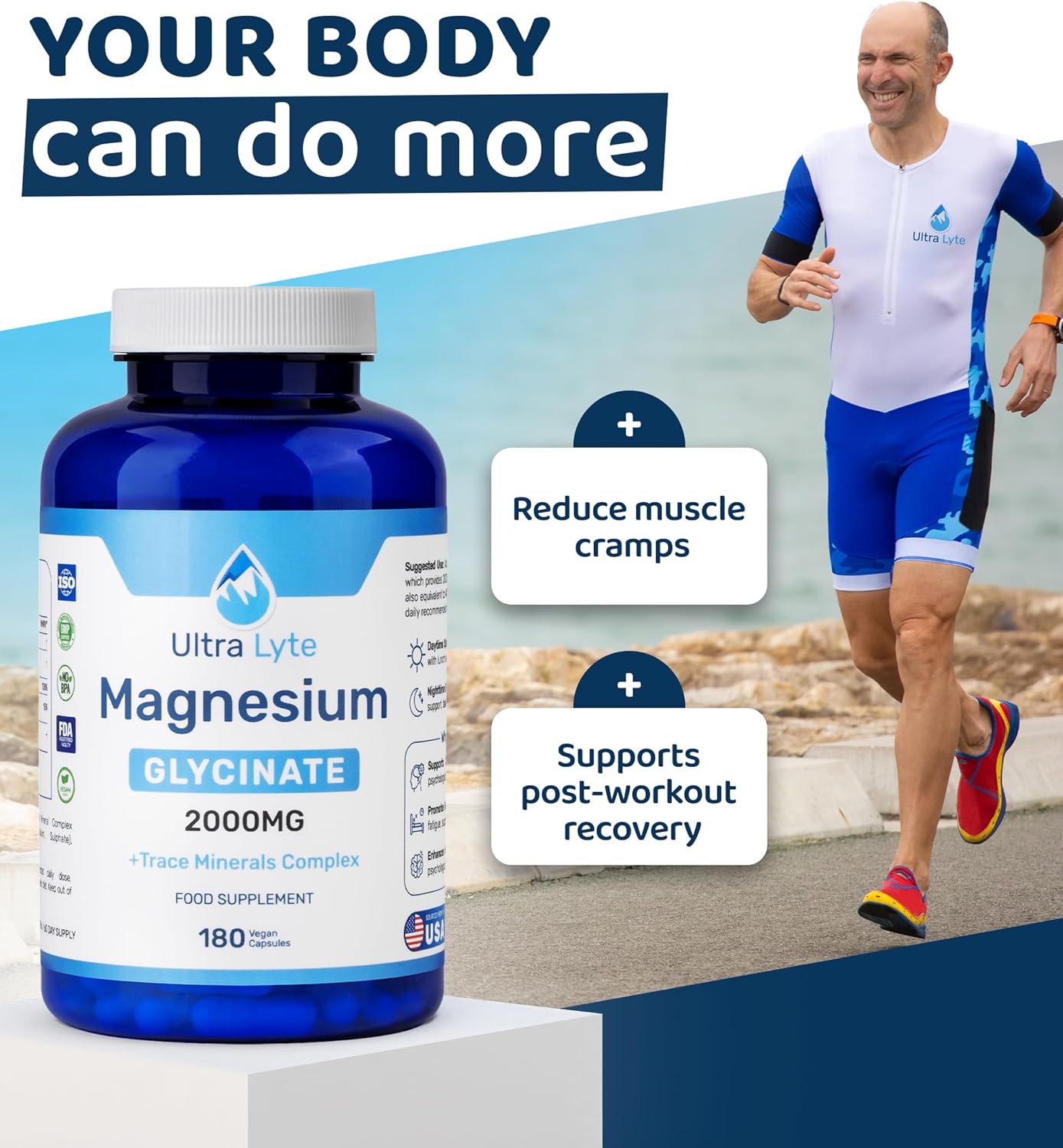 Ultra Lyte Magnesium Glycinate with Trace Minerals – High Absorption Magnesium Supplements for Sleep Aid, Stress Relief & Muscle Support – Vegan & Gluten-Free – 2000mg Magnesium – 180 Count