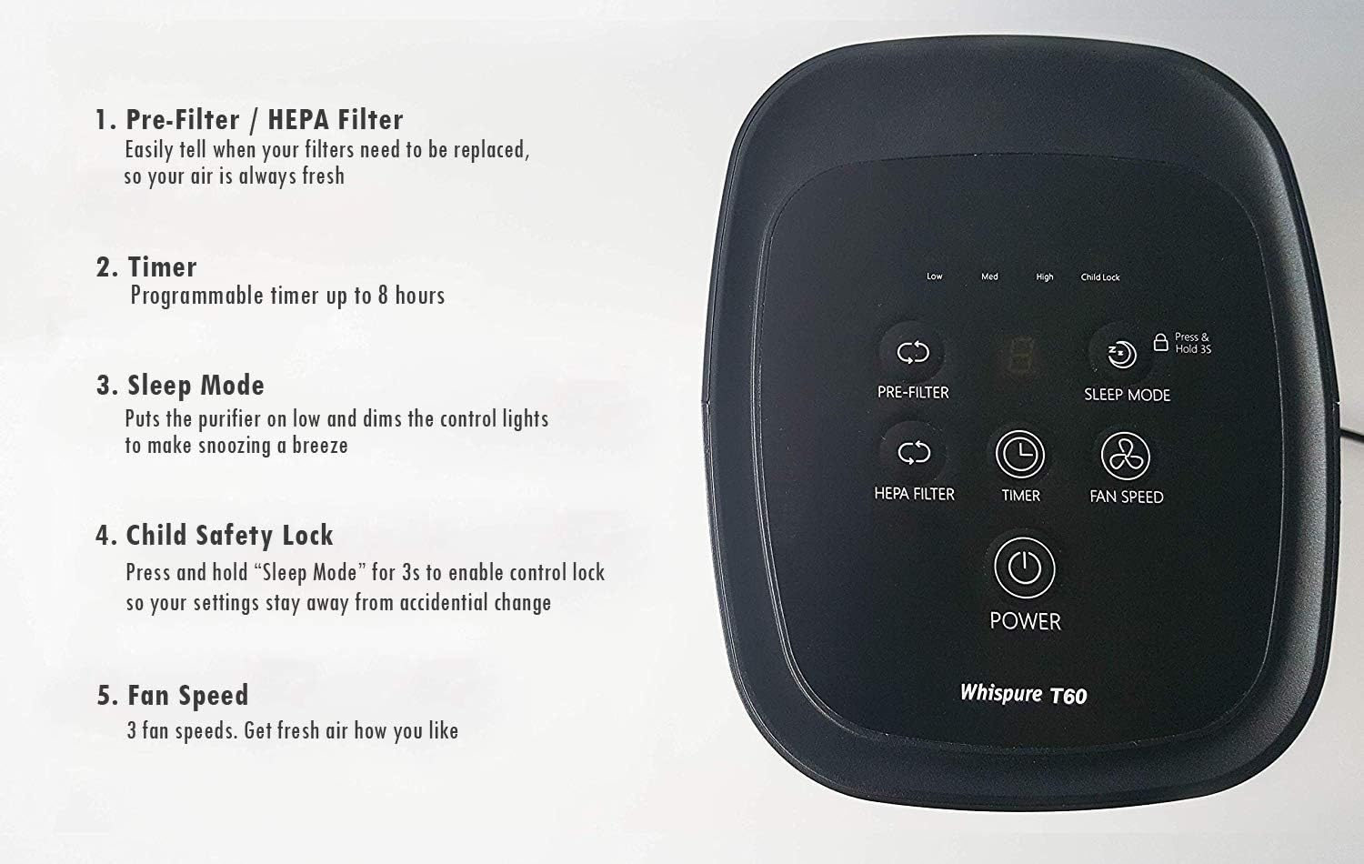 The Whirlpool WPT60B Air Cleaner Purifier is designed for medium rooms up to 120 square feet. It features electronic controls and three fan speeds, including a Sleep Mode for quiet operation. The True HEPA filter captures 99.97% of particles as small as 0.3 microns, effectively removing allergens like dust, pet dander, and pollen. Additionally, the Whishield anti-bacteria pre-filter traps odors and helps pre-clean the air before it reaches the HEPA filter.